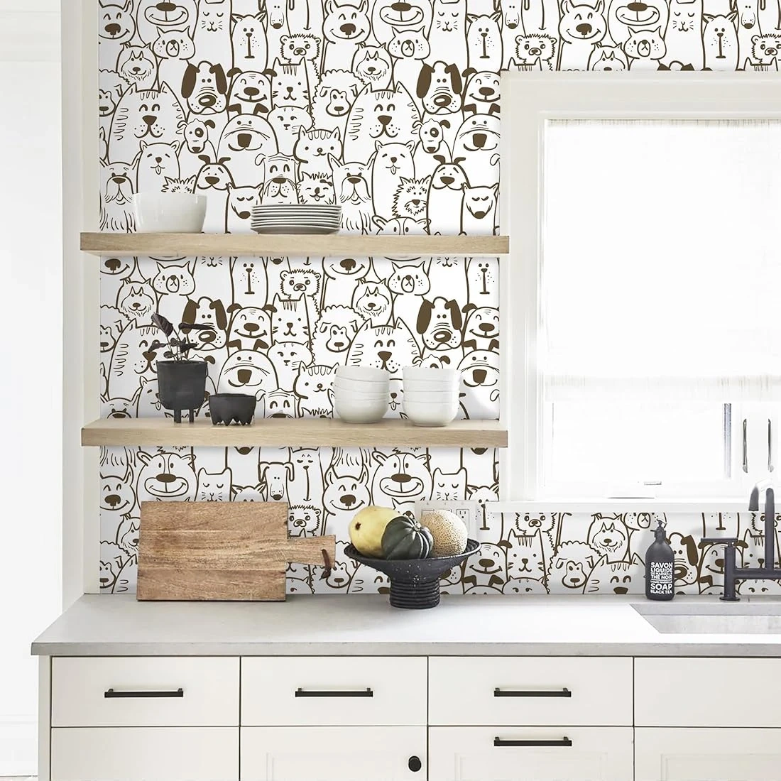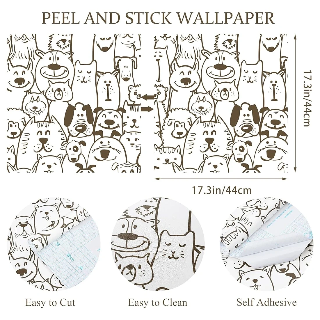 This peel and stick wallpaper features a fun brown and white dog and cat and other animals print. It's self-adhesive, removable, and easy to cut and clean. Perfect for nurseries or kids' rooms!