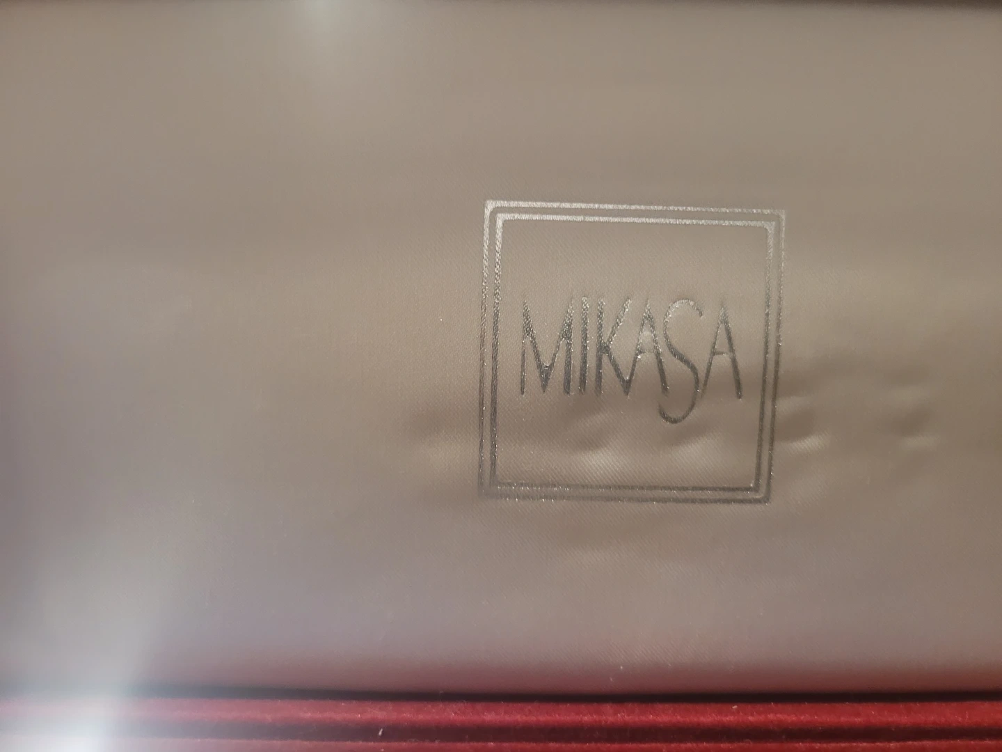 This Mikasa vanity set includes a hand mirror and a makeup brush. Both pieces have decorative glass handles and are presented in a velvet-lined box. A nice addition to any dressing table!