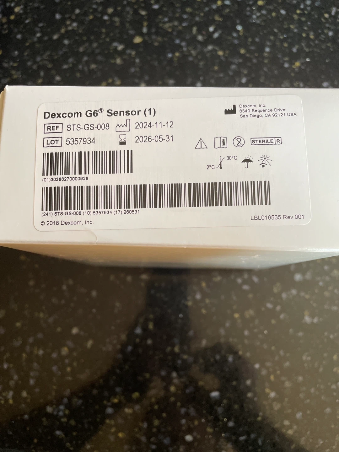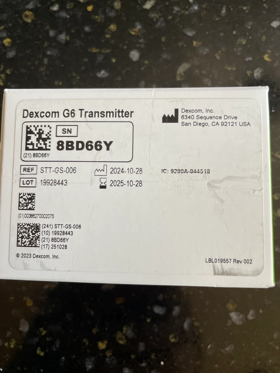 This listing includes a Dexcom G6 Transmitter and one Dexcom G6 Sensor. The transmitter expiration date is 2025-10-28, and the sensor expiration date is 2026-05-31. The transmitter lot number is 19928443, and the sensor lot number is 5357934.