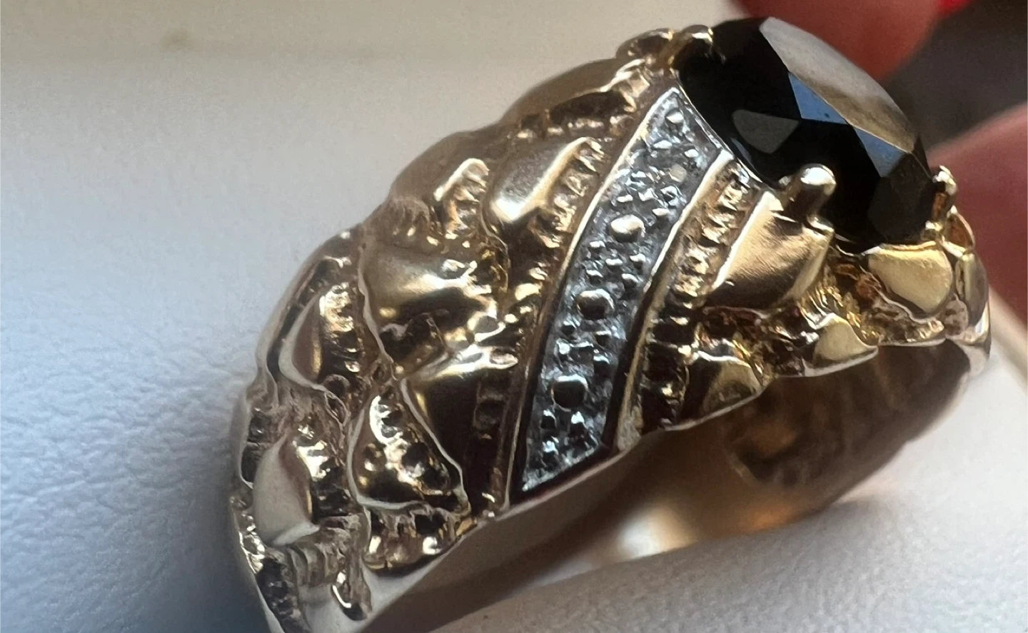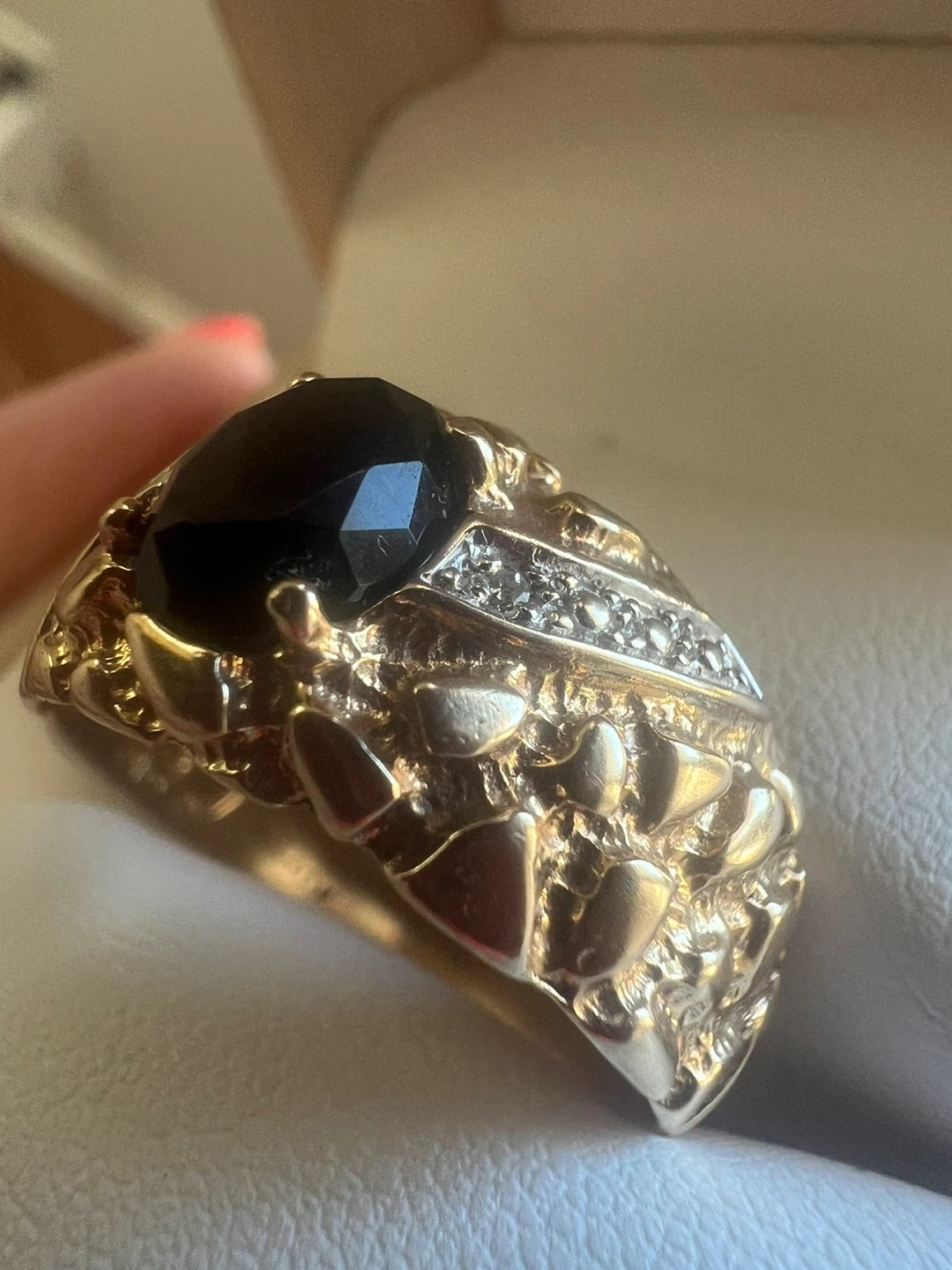 One 10K yellow gold ring featuring a black onyx and diamond accents. The ring is size 10 and has a mixed polish finish. This piece was hand assembled and cast.