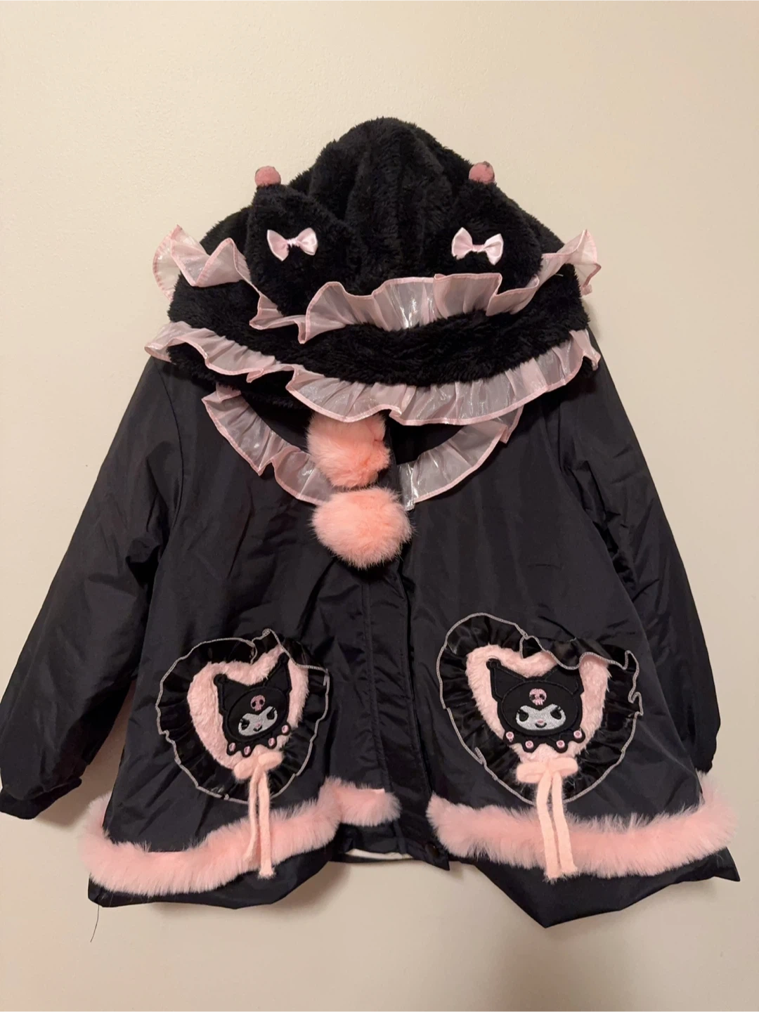 Super cute Kuromi themed winter coat! It's black with pink accents and Kuromi designs. Perfect for staying warm and stylish during the colder months