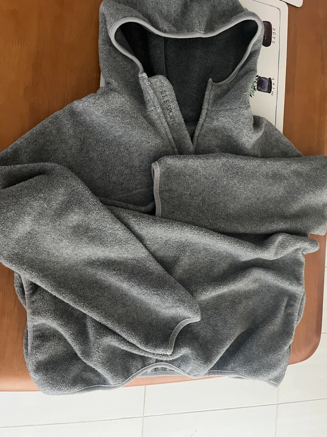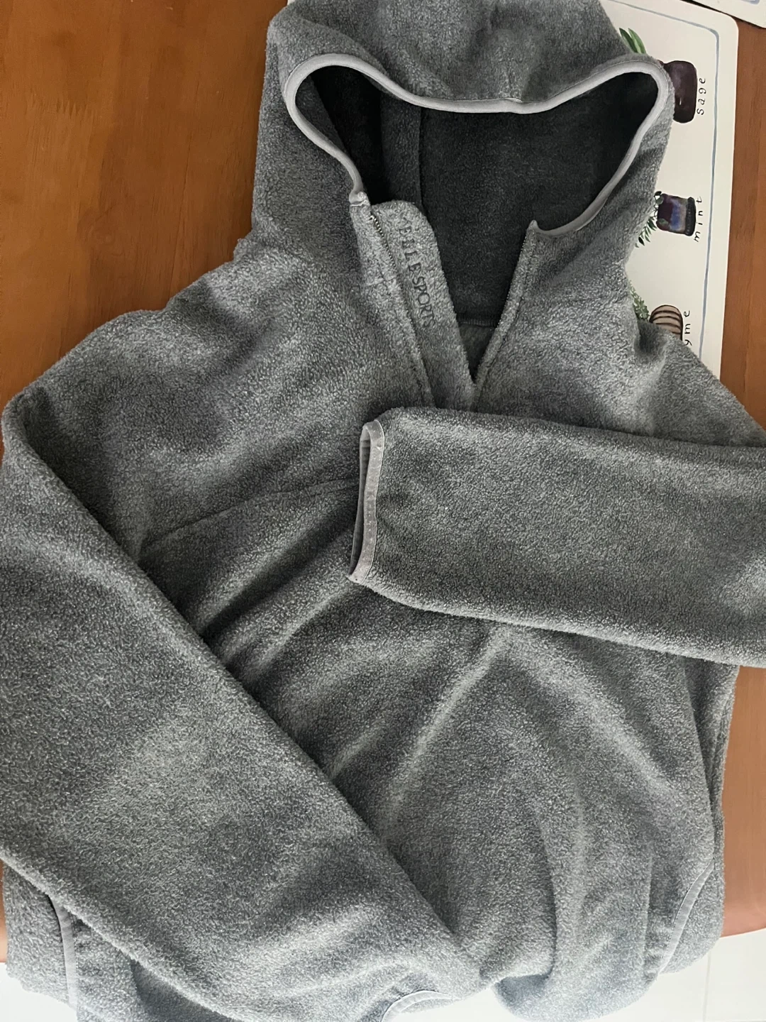 A grey fleece hoodie with a hood and quarter-zip. It's made of soft fleece material and is perfect for staying warm. Comfortable and stylish for casual wear.