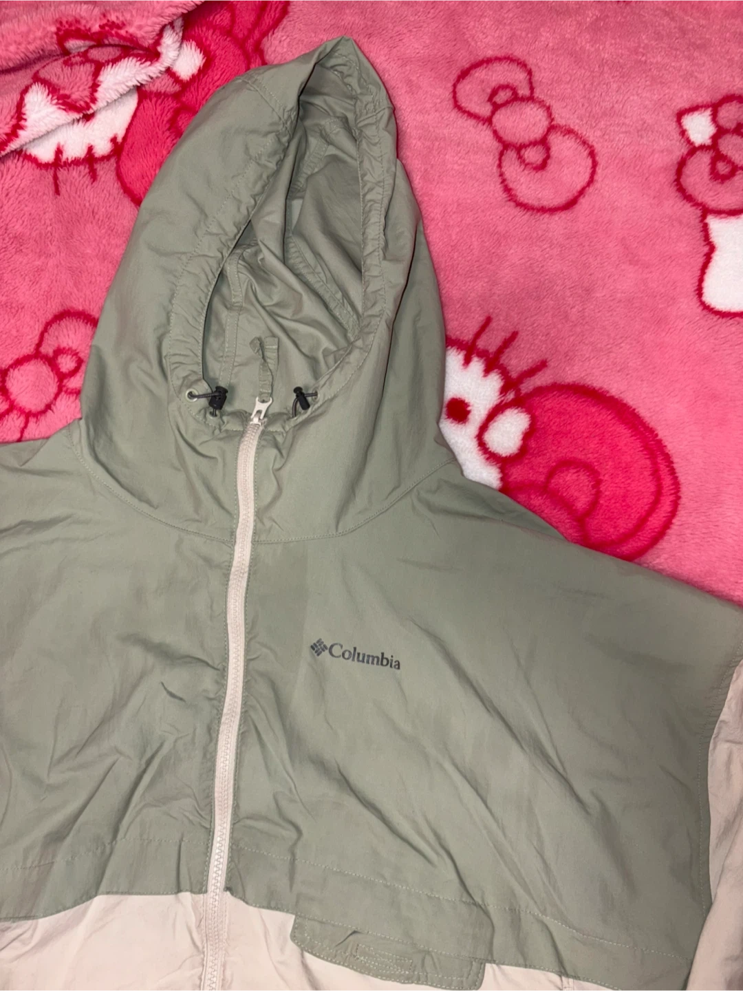 This is a Columbia Sportswear Company hooded jacket. It's a size XL. The jacket has a two-tone design with a light green upper half and a beige lower half. It features a full zip closure and an adjustable hood.