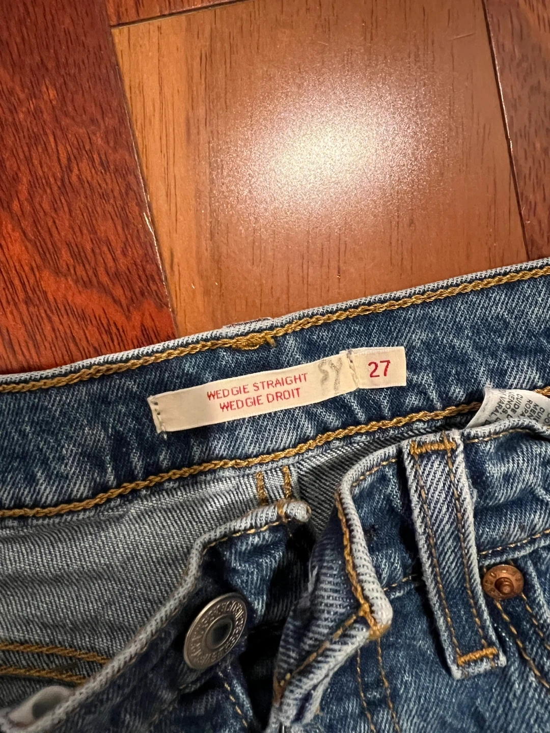 Classic blue denim jeans from Levi's. These are the Wedgie Straight style in a size 27/26