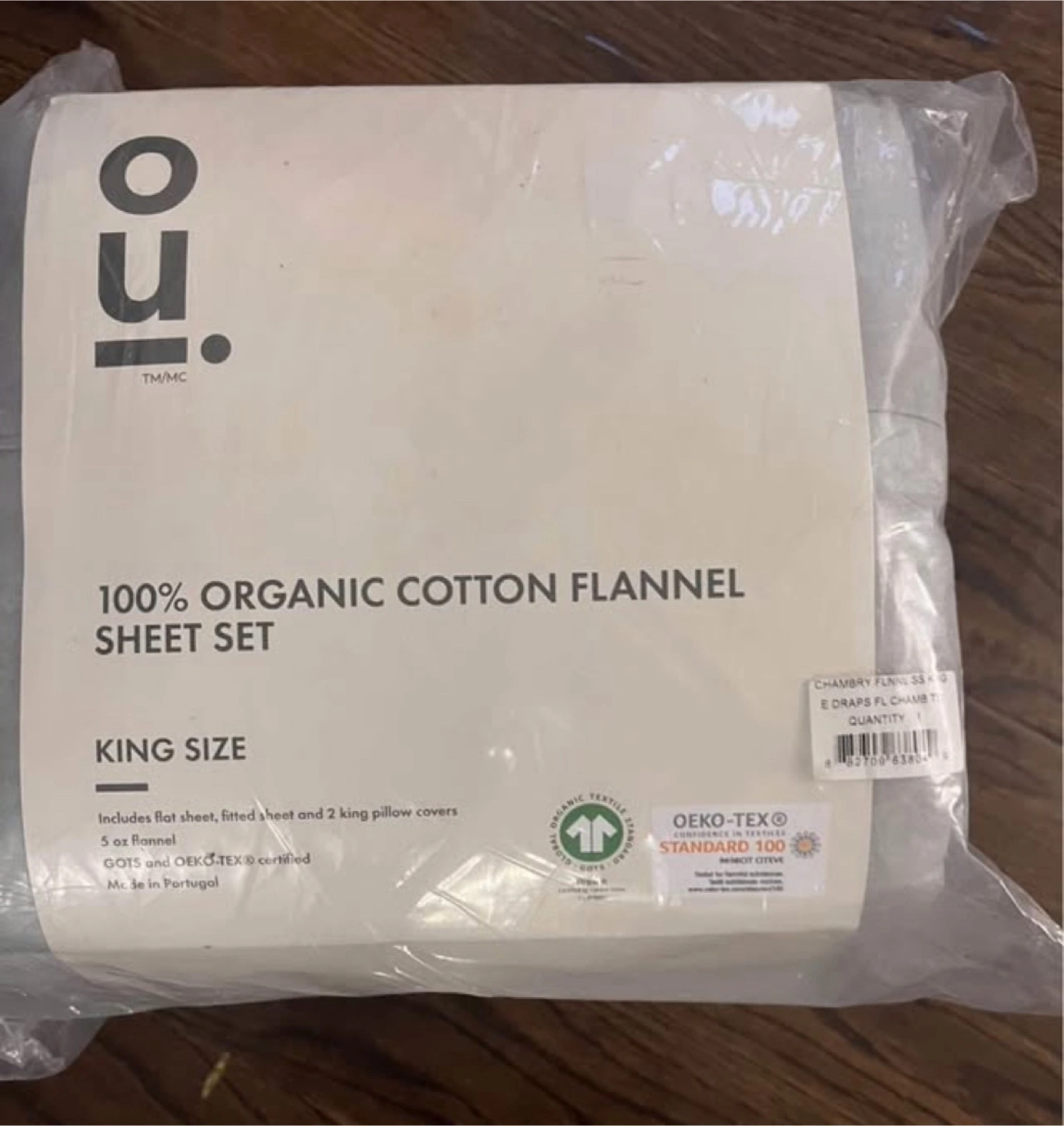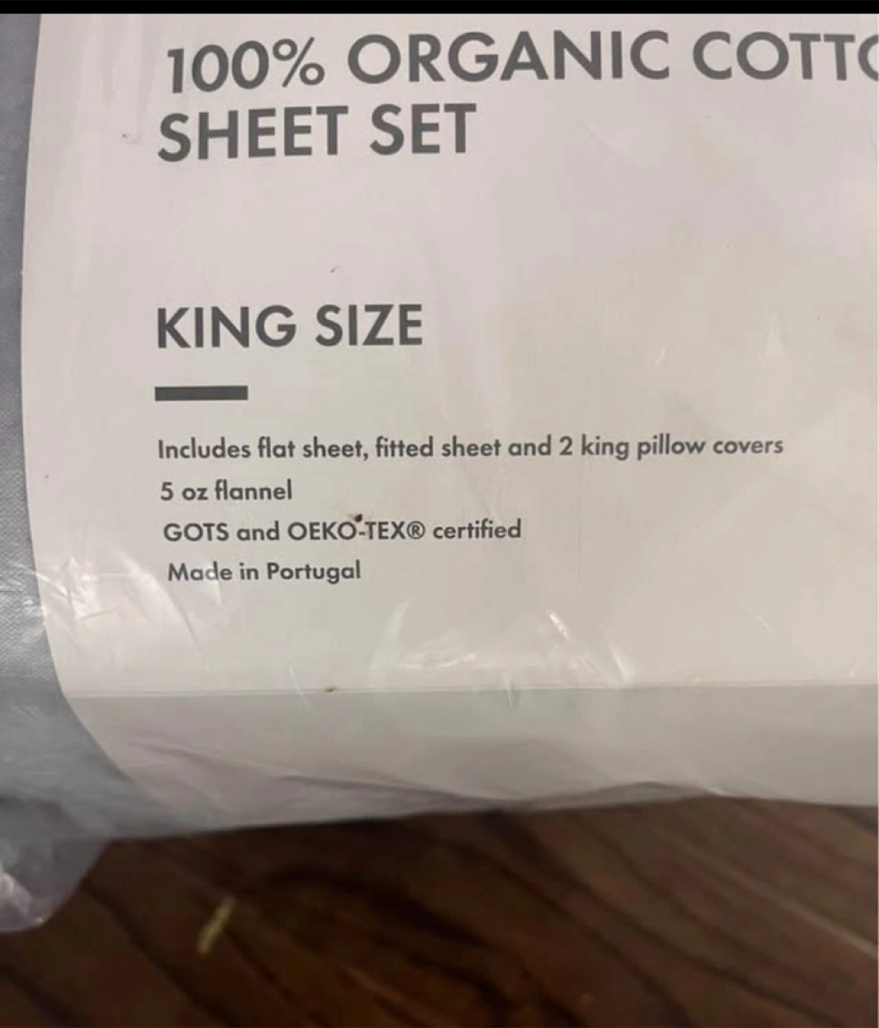 Sheet set in a clear plastic packaging. Features a flat sheet, fitted sheet and two king pillow covers. Includes 5 oz flannel. These sheets will help you unwind after a long day.