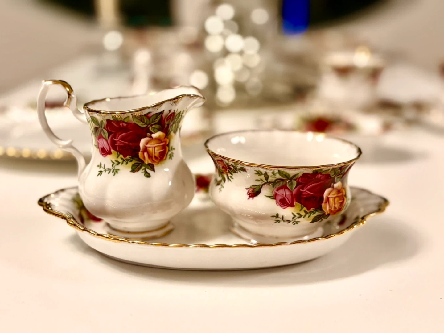 This charming Royal Albert creamer, sugar bowl, and tray set features the beloved Old Country Roses pattern. It's made of fine bone china with delicate gold trim. This set is perfect for serving cream and sugar with tea or coffee.