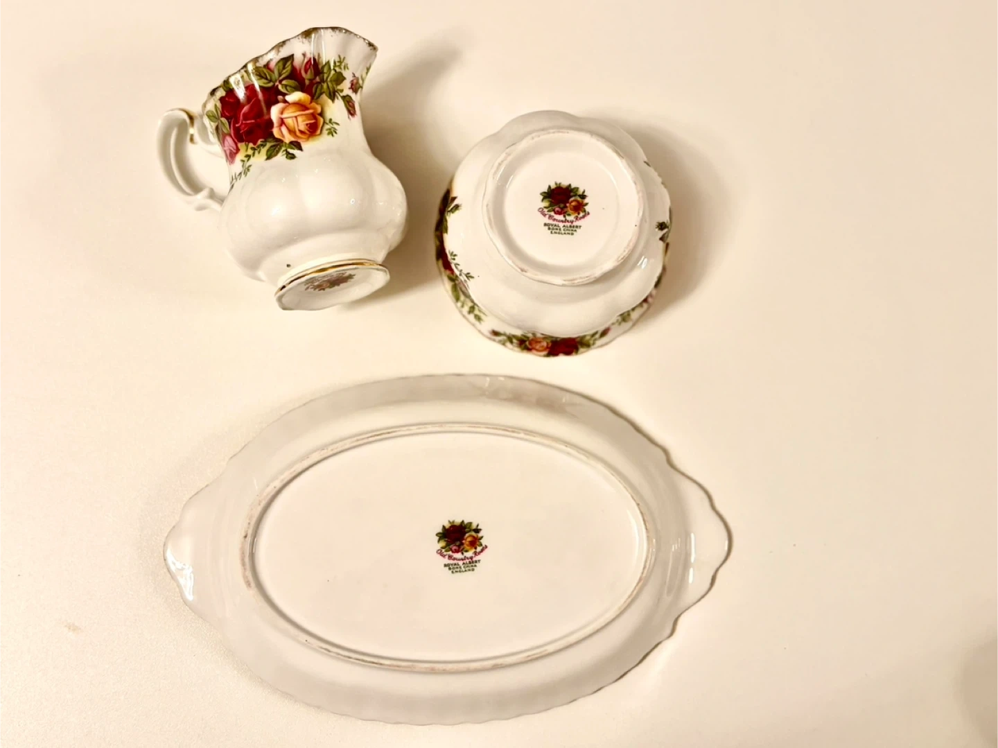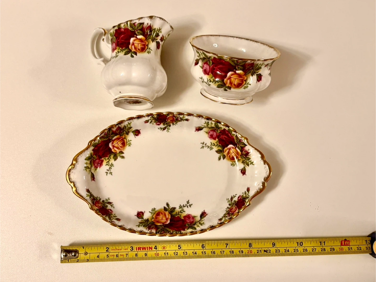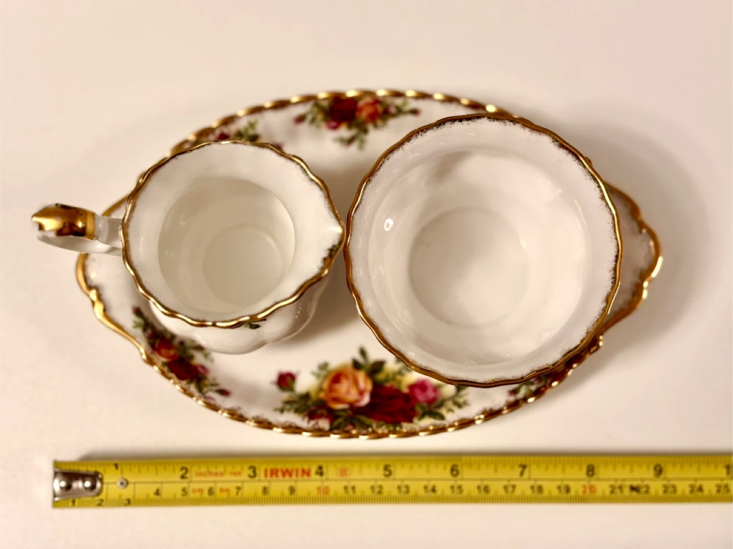This charming Royal Albert creamer, sugar bowl, and tray set features the beloved Old Country Roses pattern. It's made of fine bone china with delicate gold trim. This set is perfect for serving cream and sugar with tea or coffee.