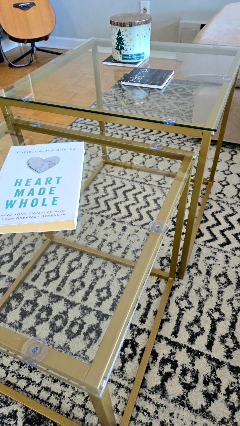 This coffee or side table set is brand new and just recently assembled. Glass top with gold steel frames can be spread out or nested together to save space. I just put the items to take pictures, but they're never used. We wanted to save space. The original price was $316, so save $$ and time. Price is not negotiable, so please don't ask for a lower price. See dimensions in one of the pics.