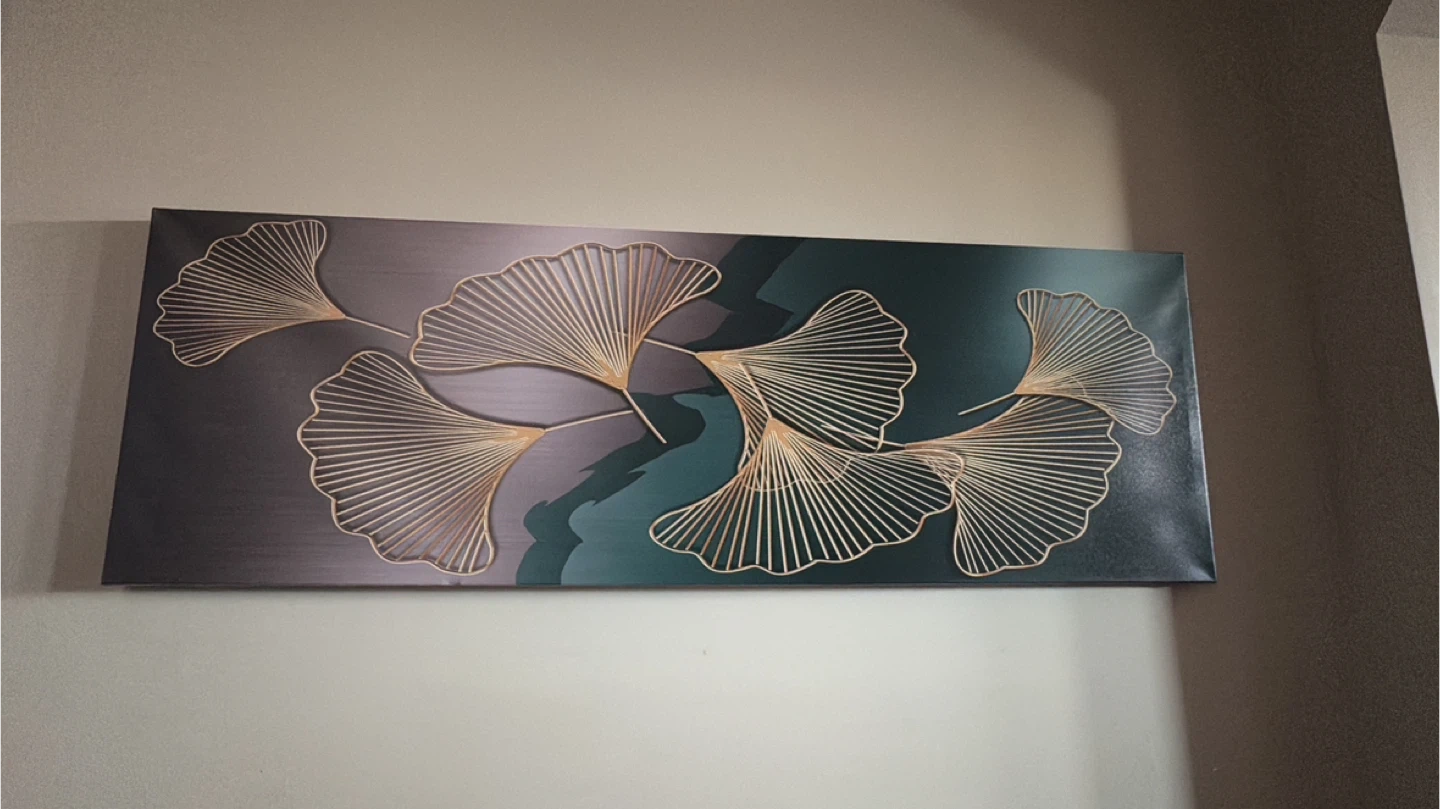A beautiful canvas wall art featuring gold ginkgo leaf designs against a dark, abstract background. It's a statement piece that adds a touch of elegance to any room. The artwork is printed on canvas and framed.