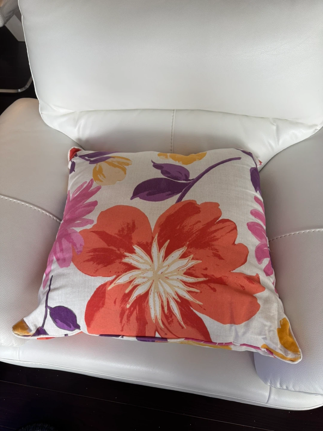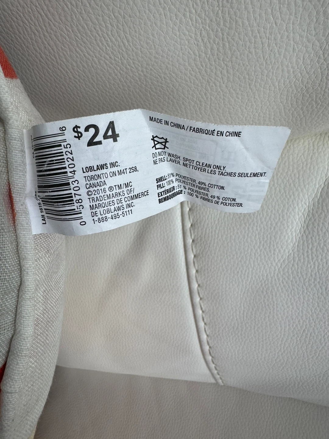 Shell is 51% polyester / 49% cotton, with 100% polyester filling. Size: 22 inches by 22 inches. Perfect for brightening up any couch, chair, or bedroom. This is new . Pick up location : close to Steeles and Buthurst intersection . From pet free, smole free home.