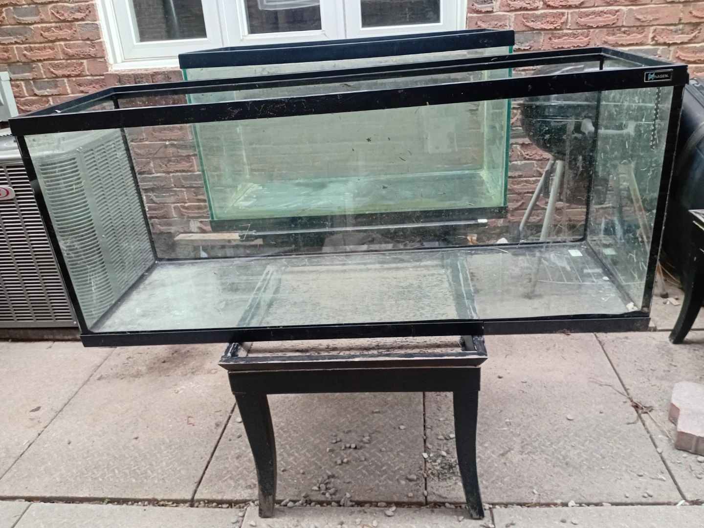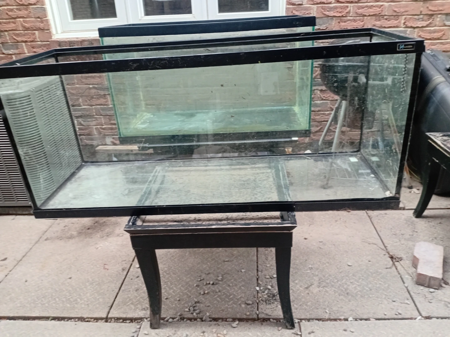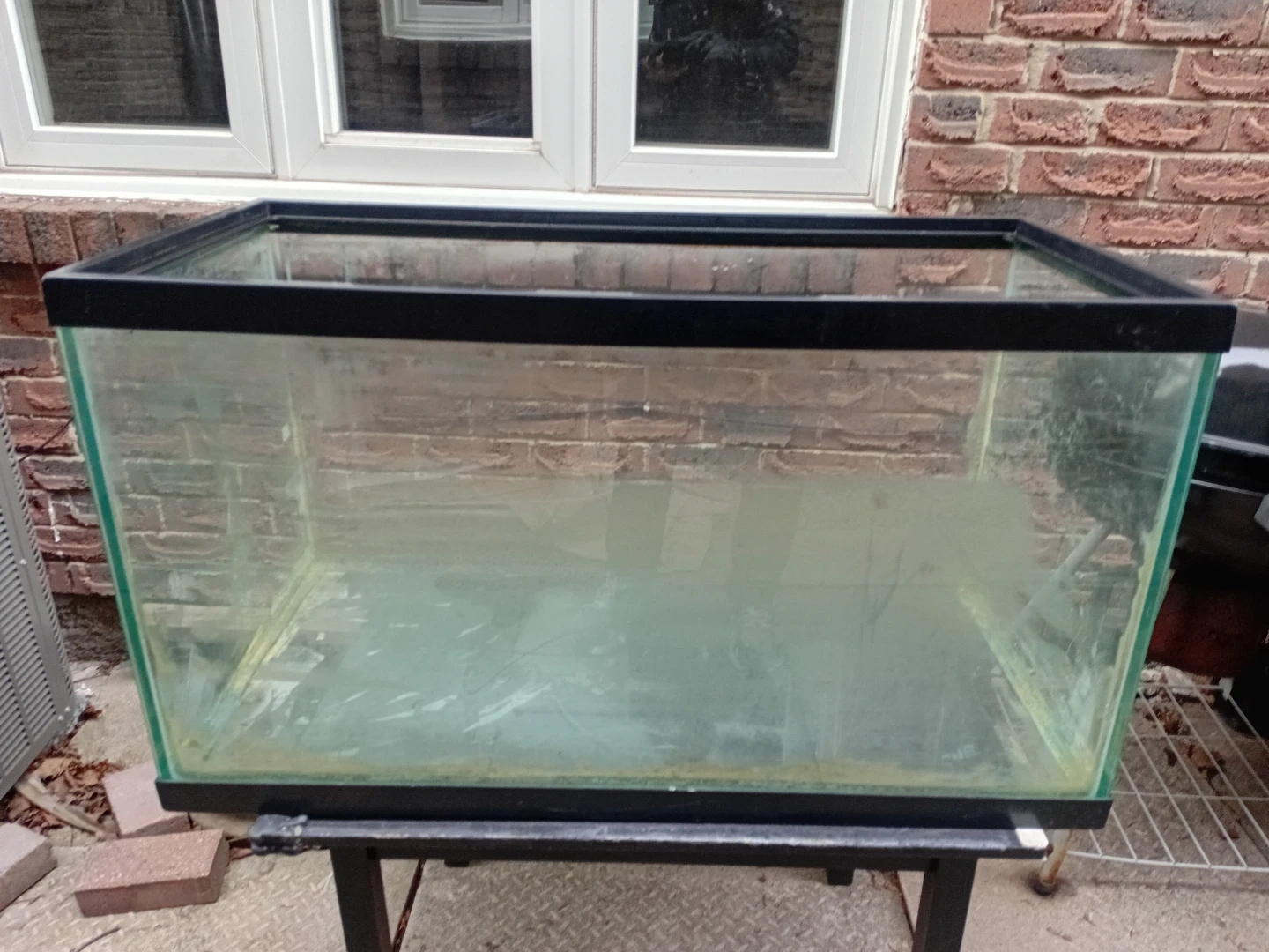 This is a large glass aquarium tank. It's made of glass with a black plastic trim. It's 48 inches legth 20 inches width And 36 inches Legth 21 inches Width empty and ready for a new home. This tank would be great for a variety of fish or other aquatic pets!