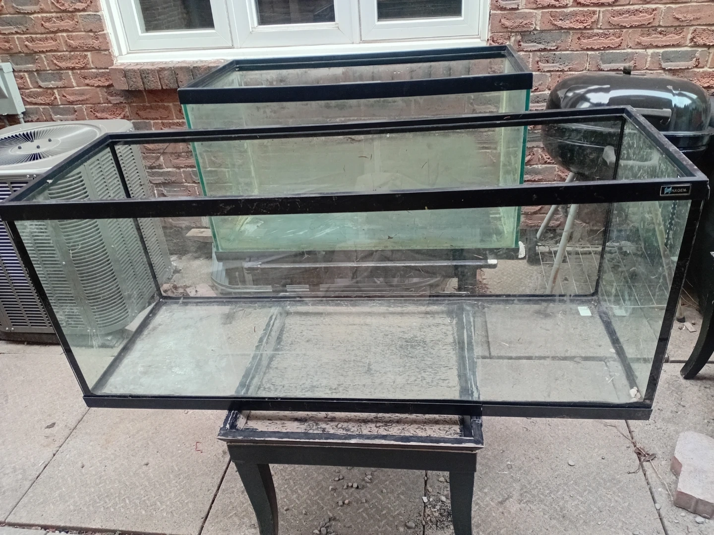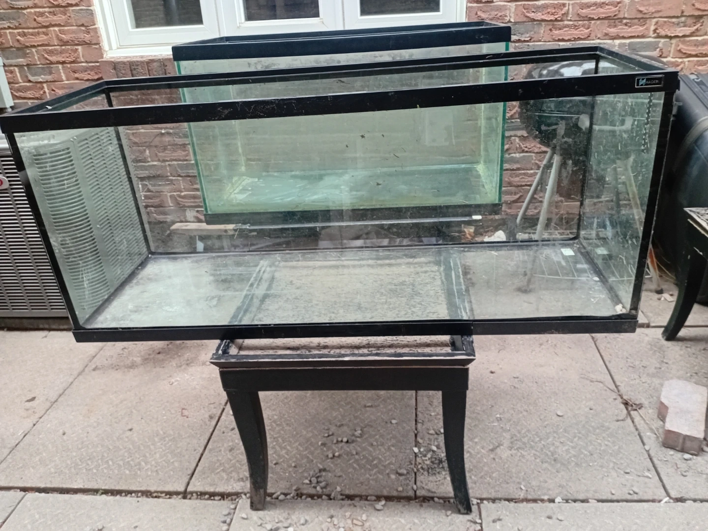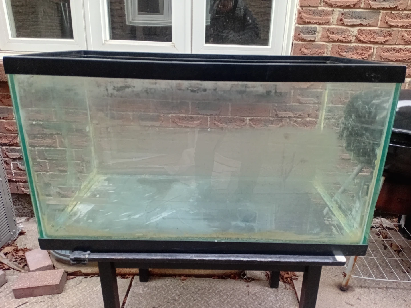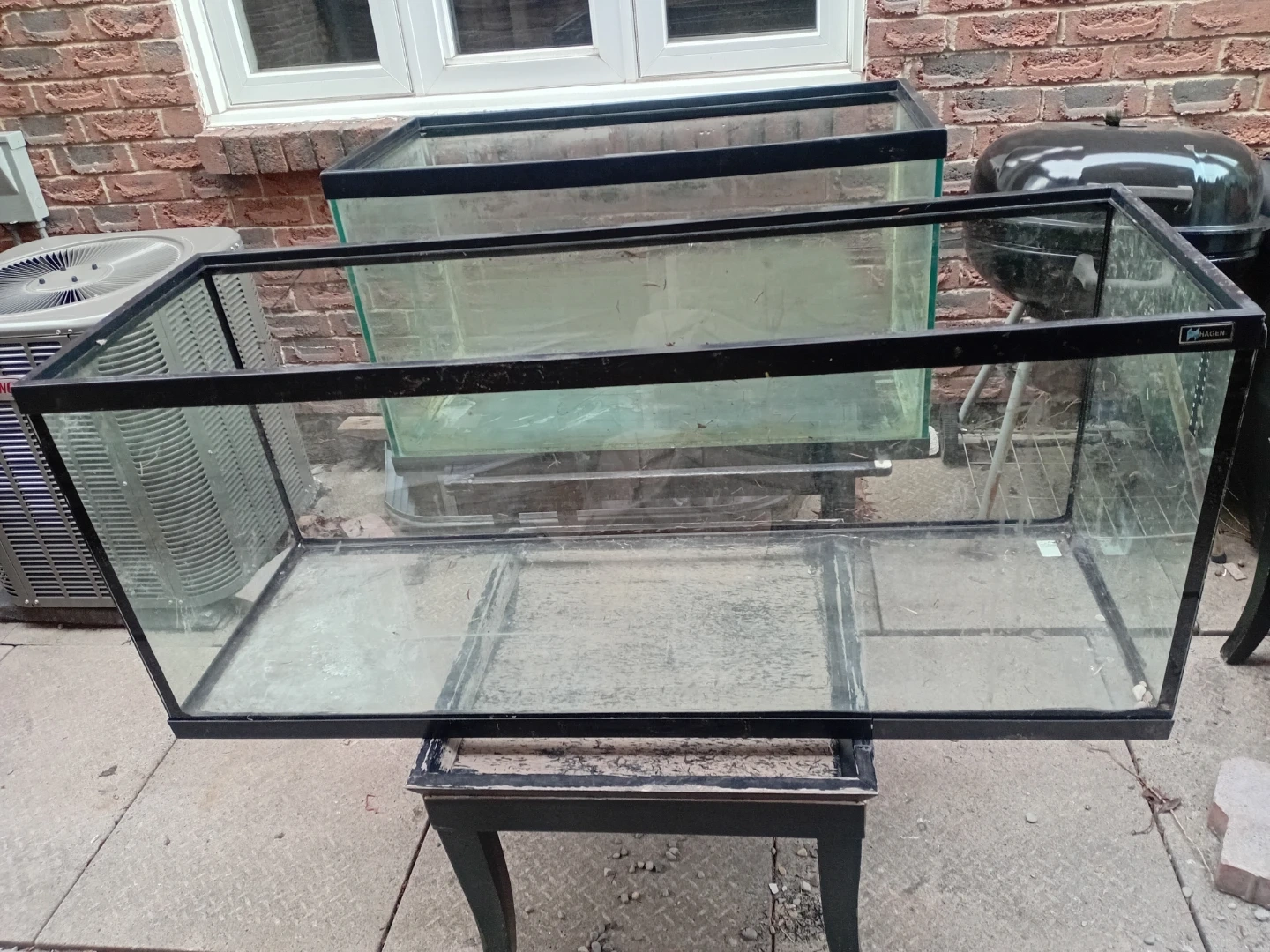 This is a large glass aquarium tank. It's made of glass with a black plastic trim. It's 48 inches legth 20 inches width And 36 inches Legth 21 inches Width empty and ready for a new home. This tank would be great for a variety of fish or other aquatic pets!