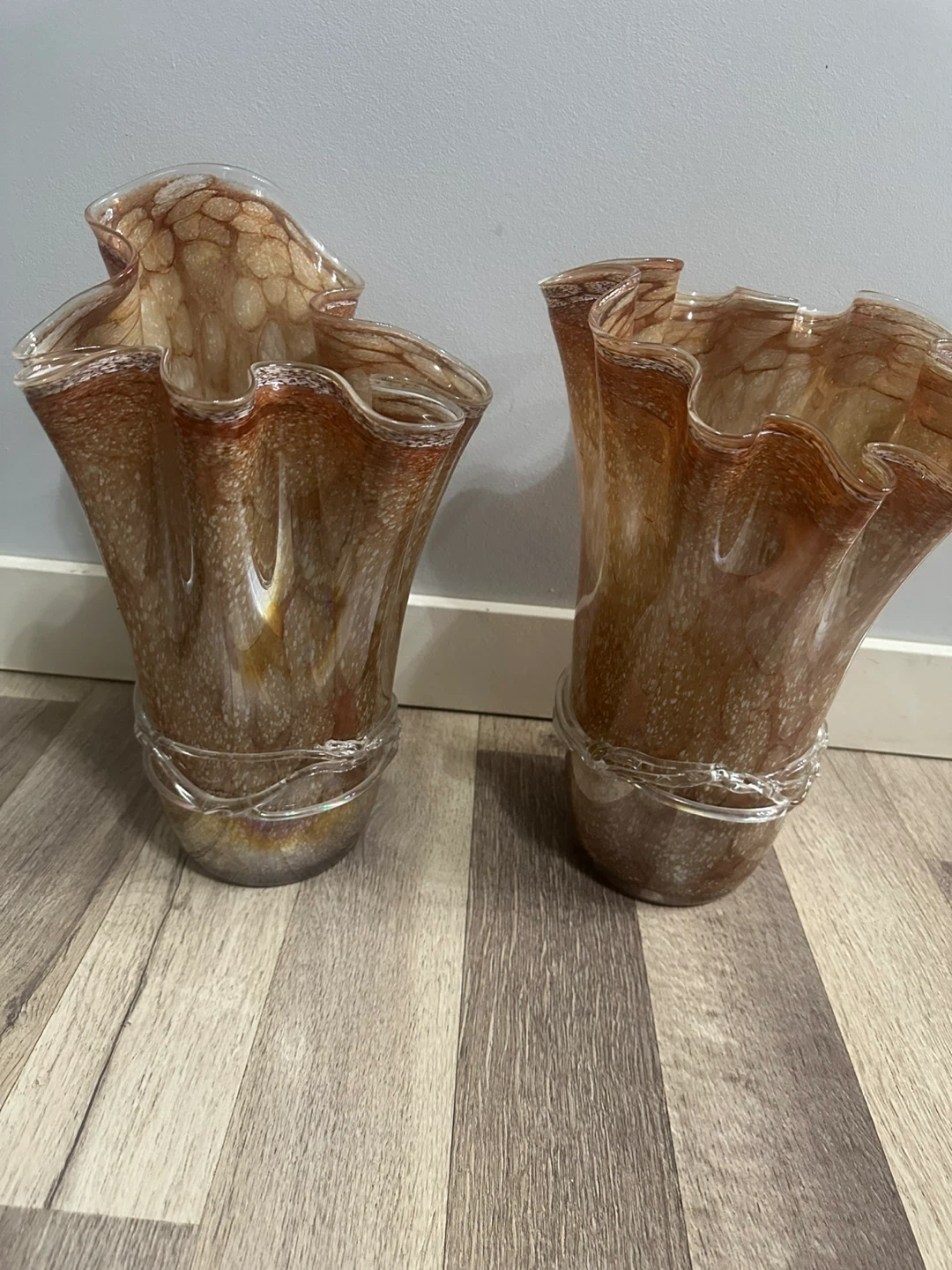 These beautiful vases have a Murano-style art glass design with a unique ruffled edge. They would make a great addition to any home decor. Perfect for displaying flowers or as standalone art pieces