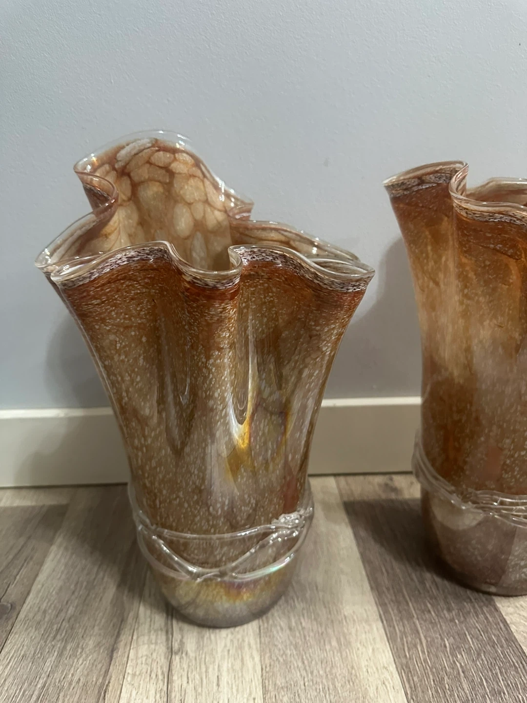 These beautiful vases have a Murano-style art glass design with a unique ruffled edge. They would make a great addition to any home decor. Perfect for displaying flowers or as standalone art pieces