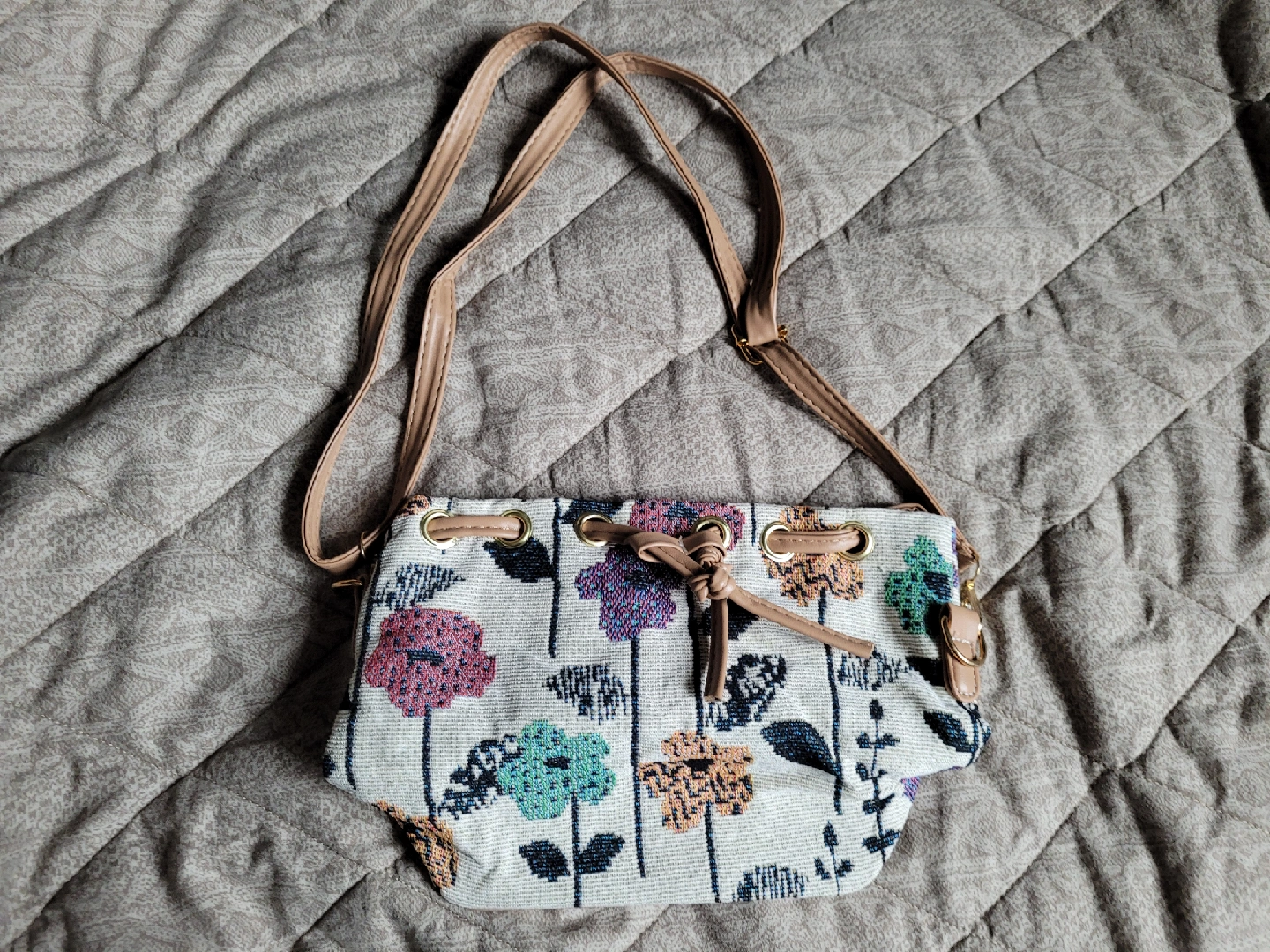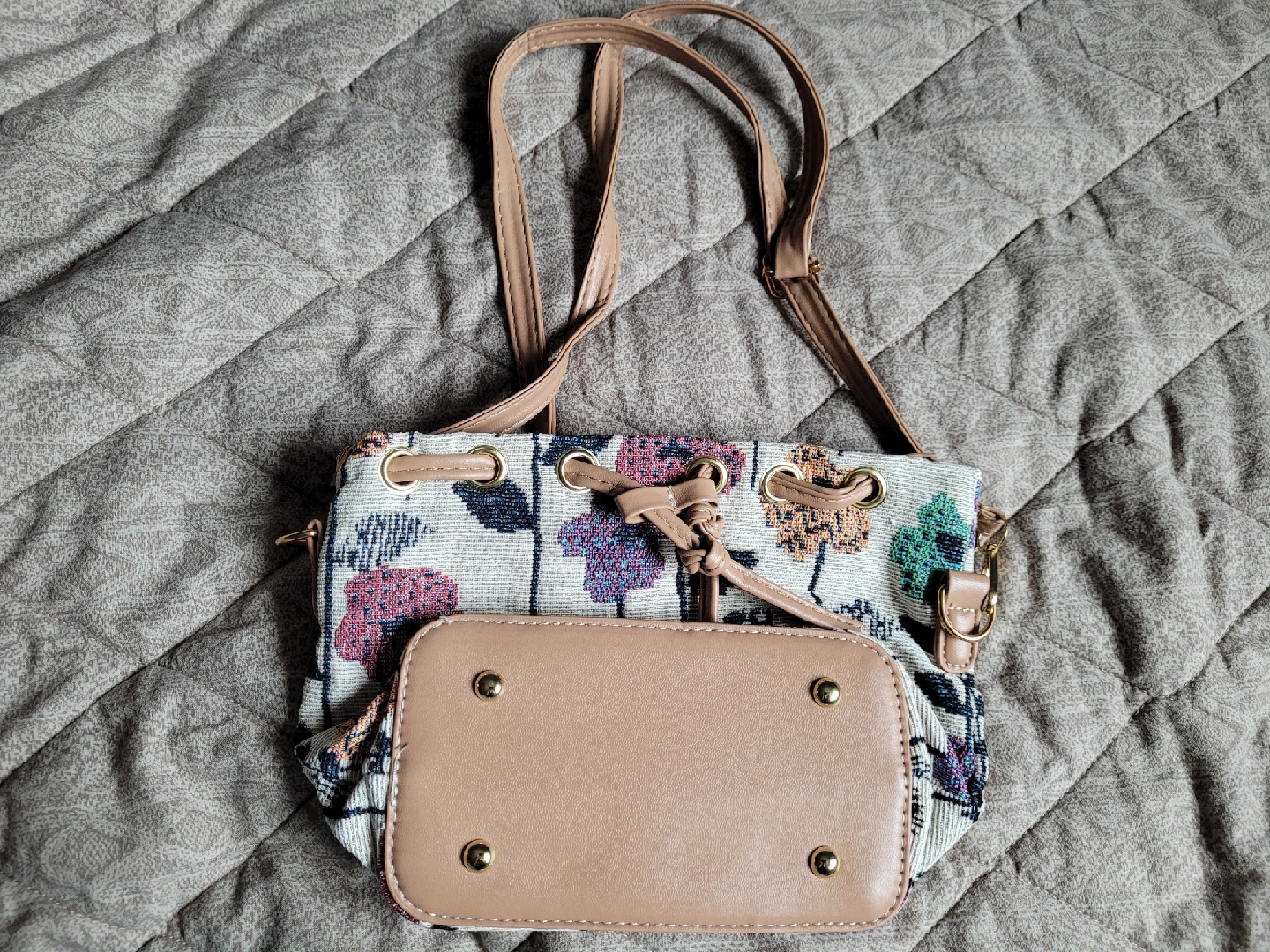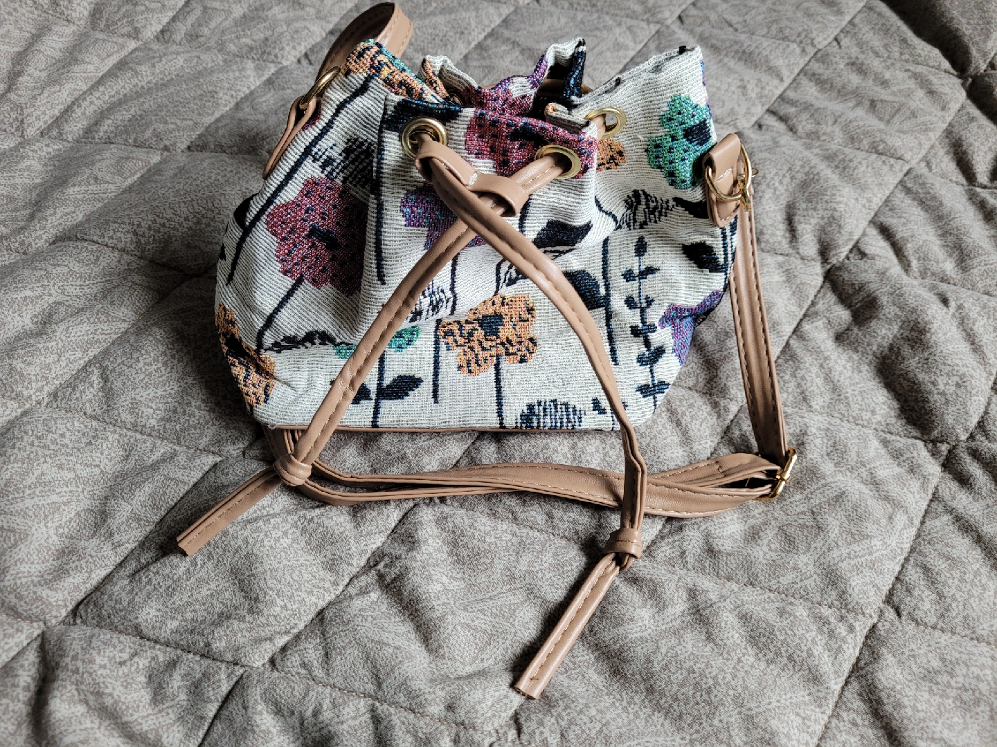 Features a floral tapestry design in a woven canvas with a drawstring closure and adjustable leather straps.