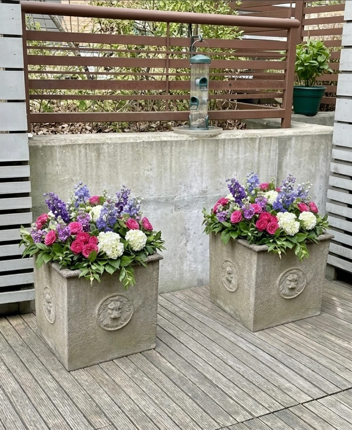 Two stone square planters, each featuring a decorative lion emblem. Perfect for adding a touch of classic elegance to your garden or patio. These planters measure approximately 16 inches on each side.