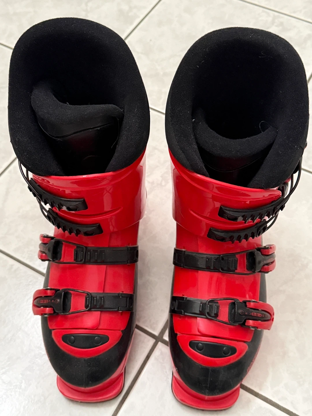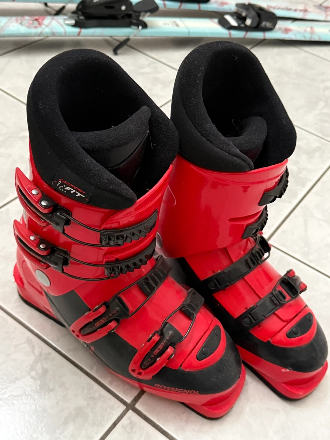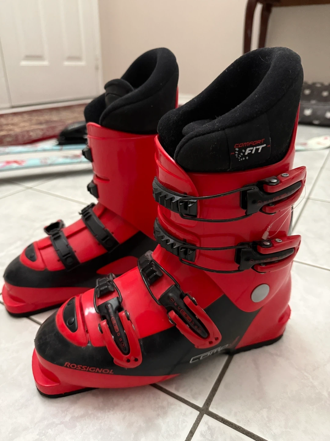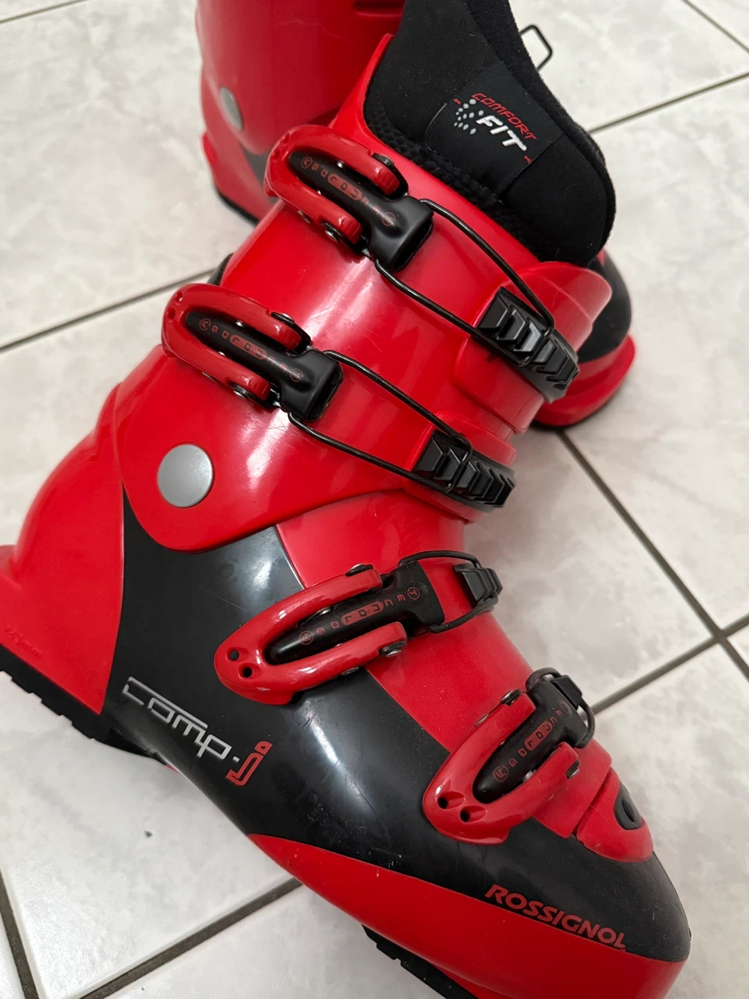 Selling a pair of Rossignol Comp J ski boots in red. They are in good condition and ready for the slopes! They feature a comfort fit and are perfect for beginner to intermediate skiers. Get ready for some fun on the mountain! Size 24.5