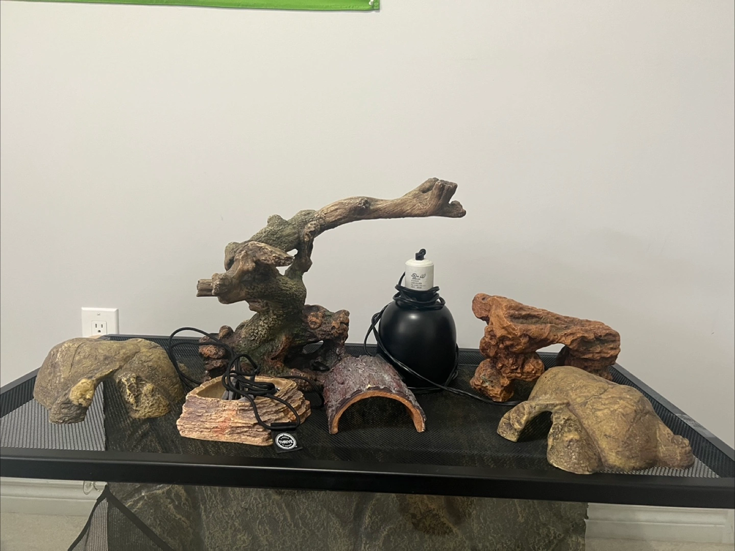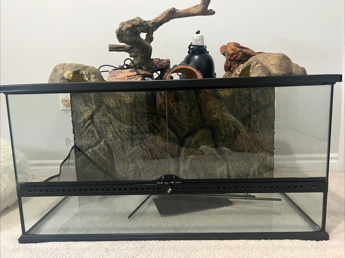 Selling a complete reptile habitat setup. Includes a terrarium, various decorative rocks and wood, and a heat lamp. Perfect for creating a comfortable and enriching environment for your reptile friend! The setup is in great condition and ready for a new home