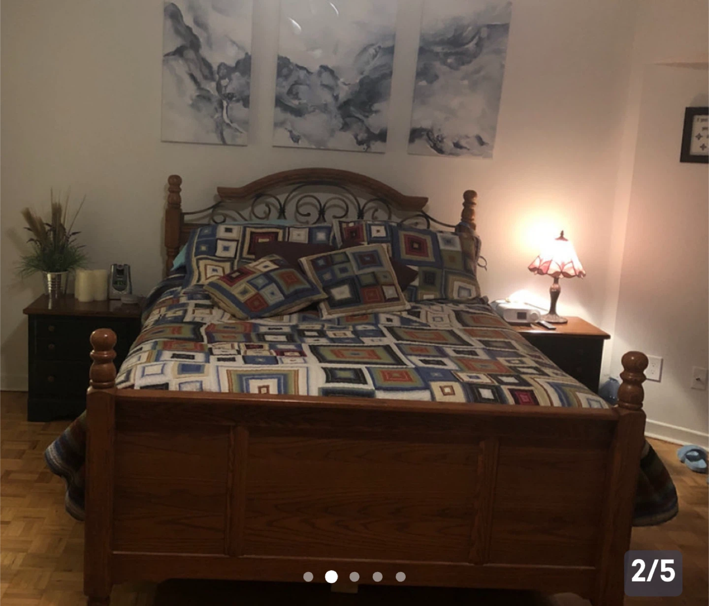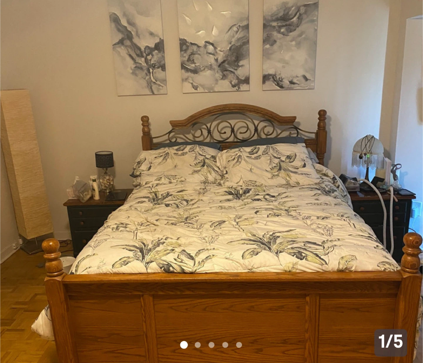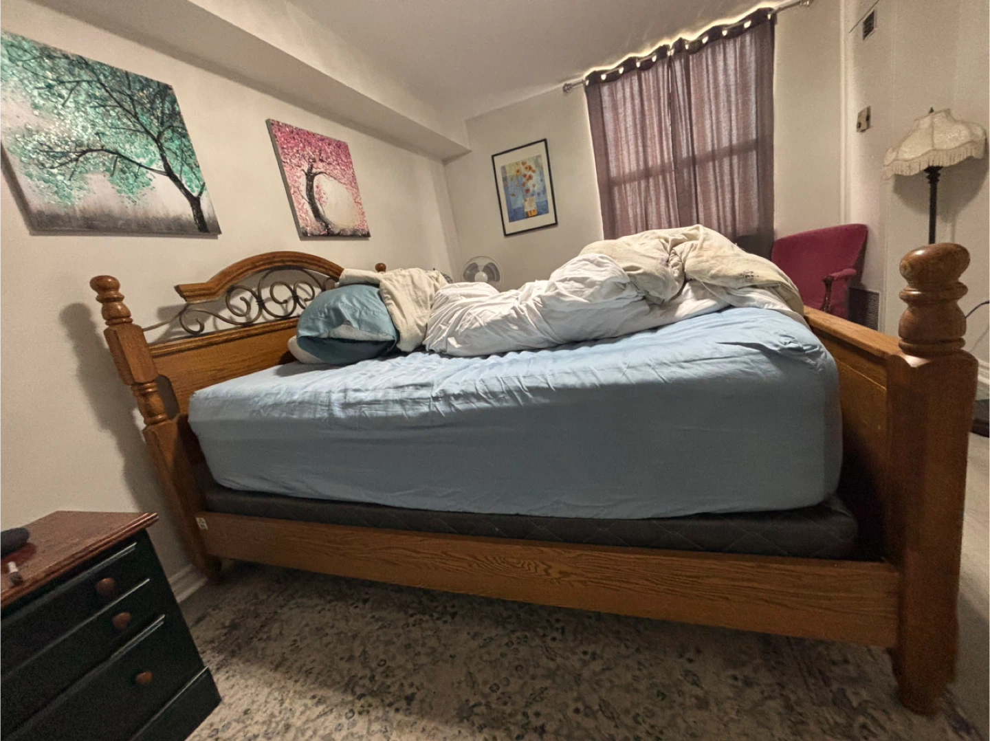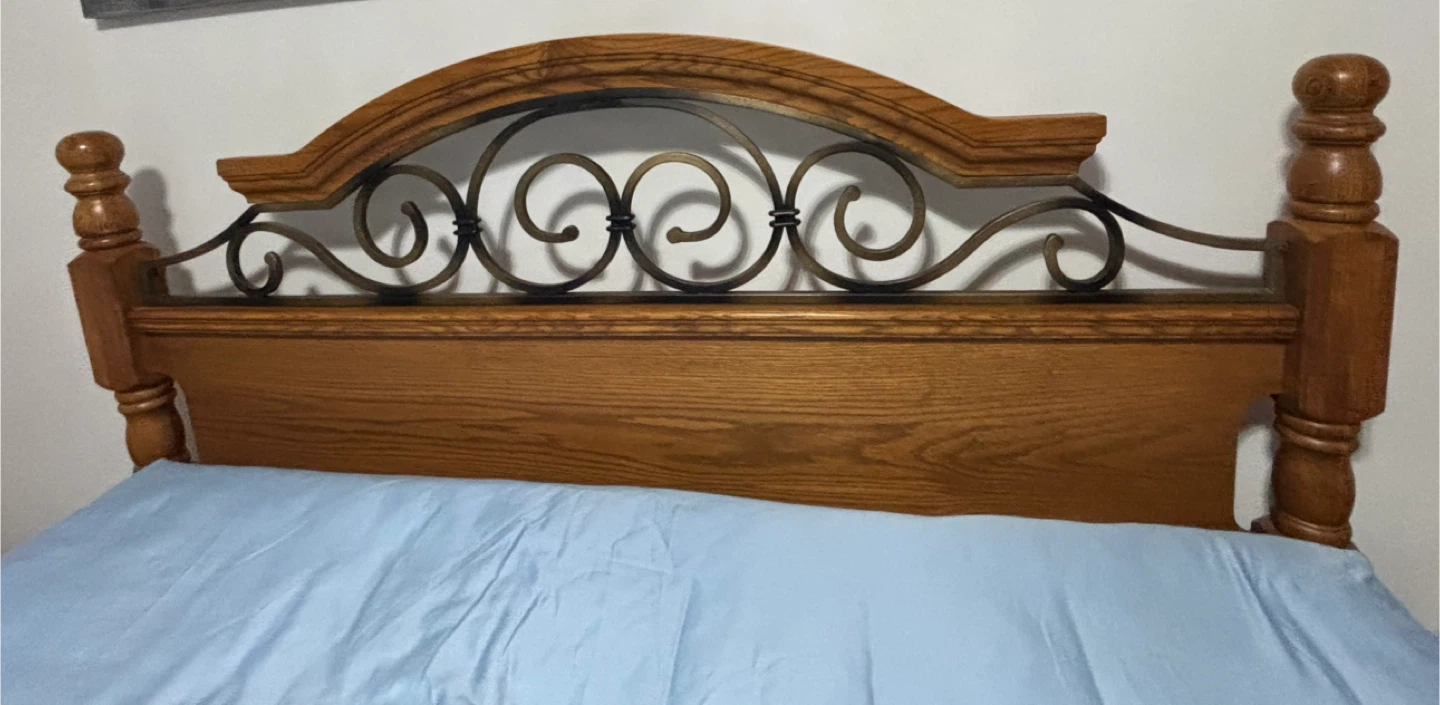Selling a wooden bed frame. It has a lovely, classic design with a decorative metal scrollwork headboard. Perfect for adding a touch of elegance to your bedroom!