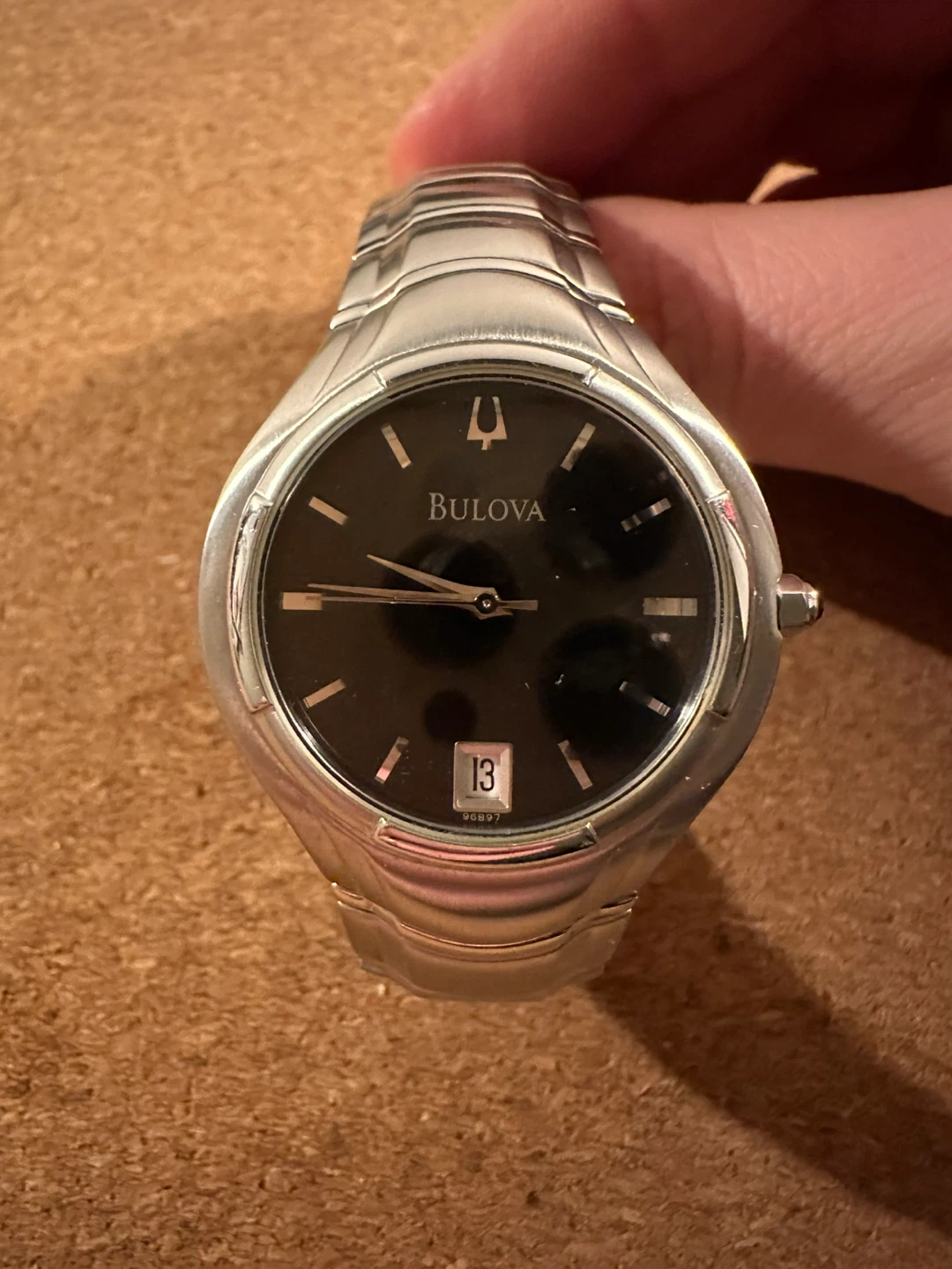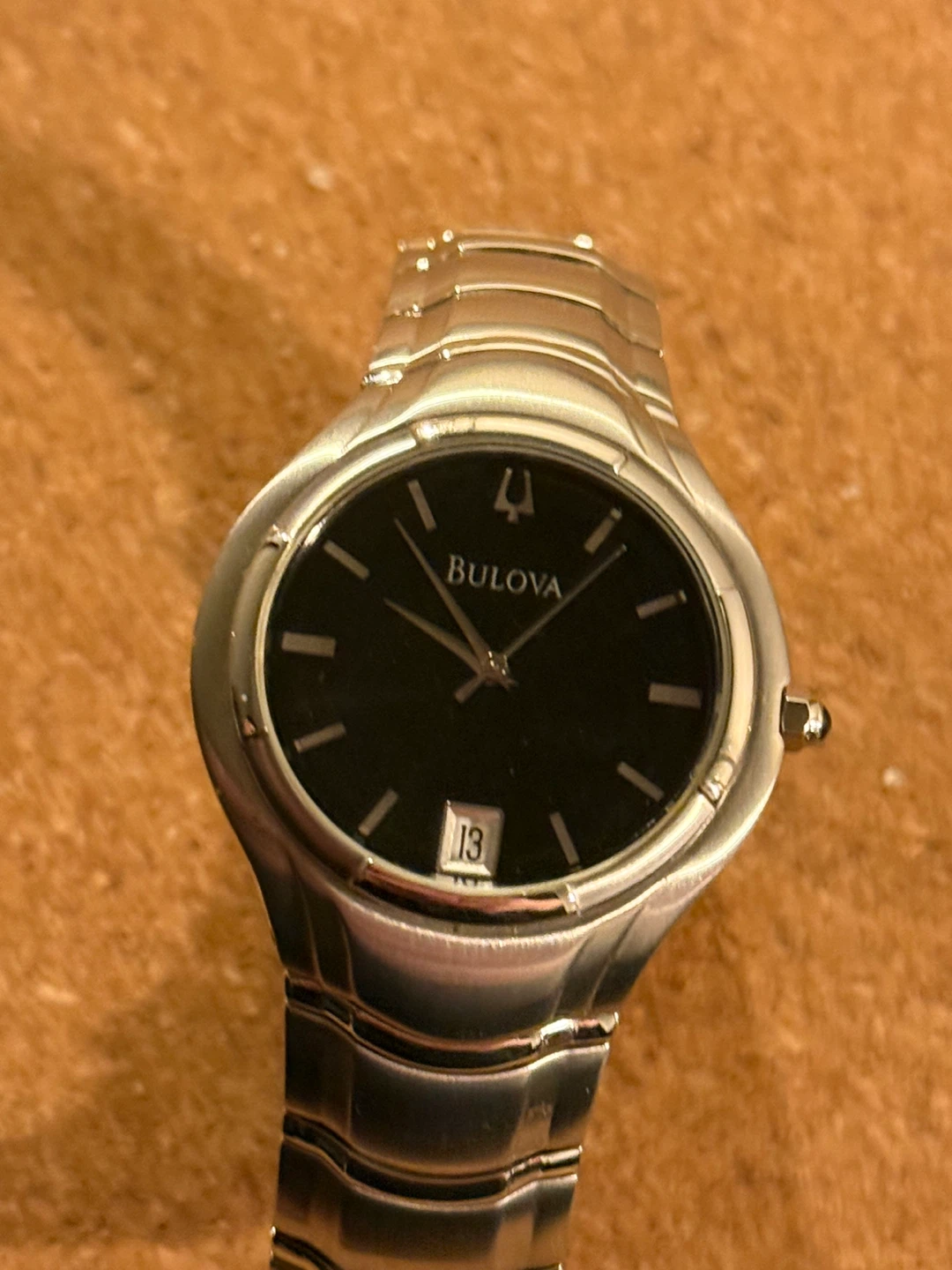 Selling a Bulova men's watch. It's a stainless steel design with a black face and date display. The watch is water resistant and has a stainless steel case. It's a stylish timepiece for everyday wear