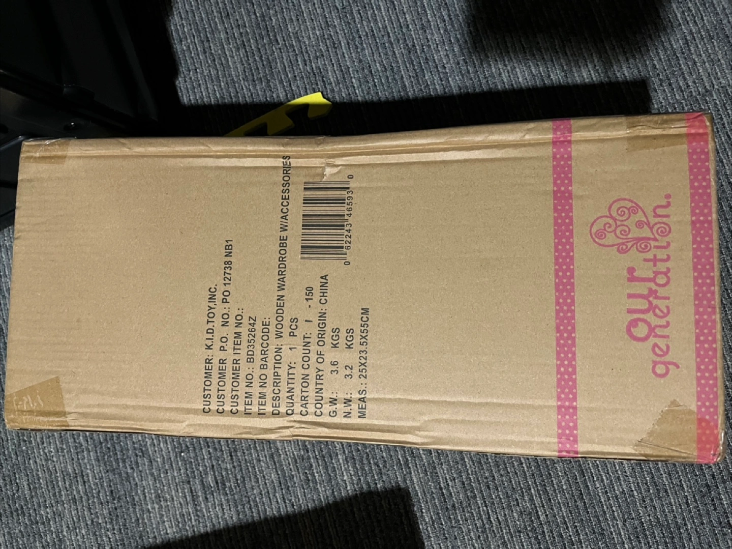 Selling a wooden wardrobe with accessories from Our Generation. The box indicates it contains one piece and its dimensions are 25x23.5x55cm