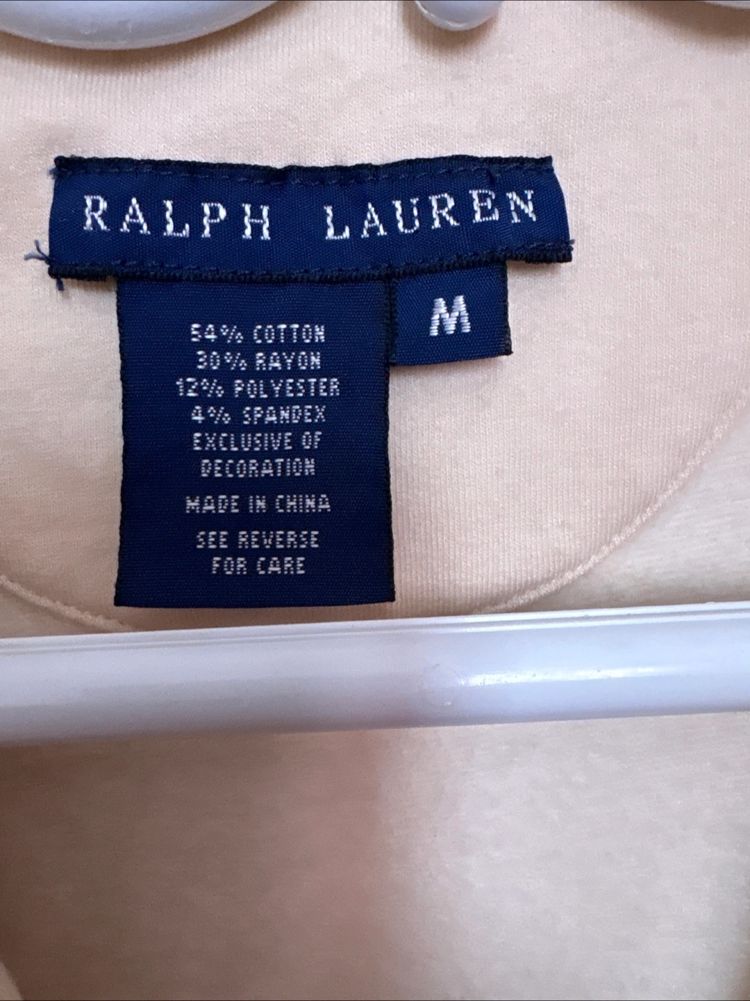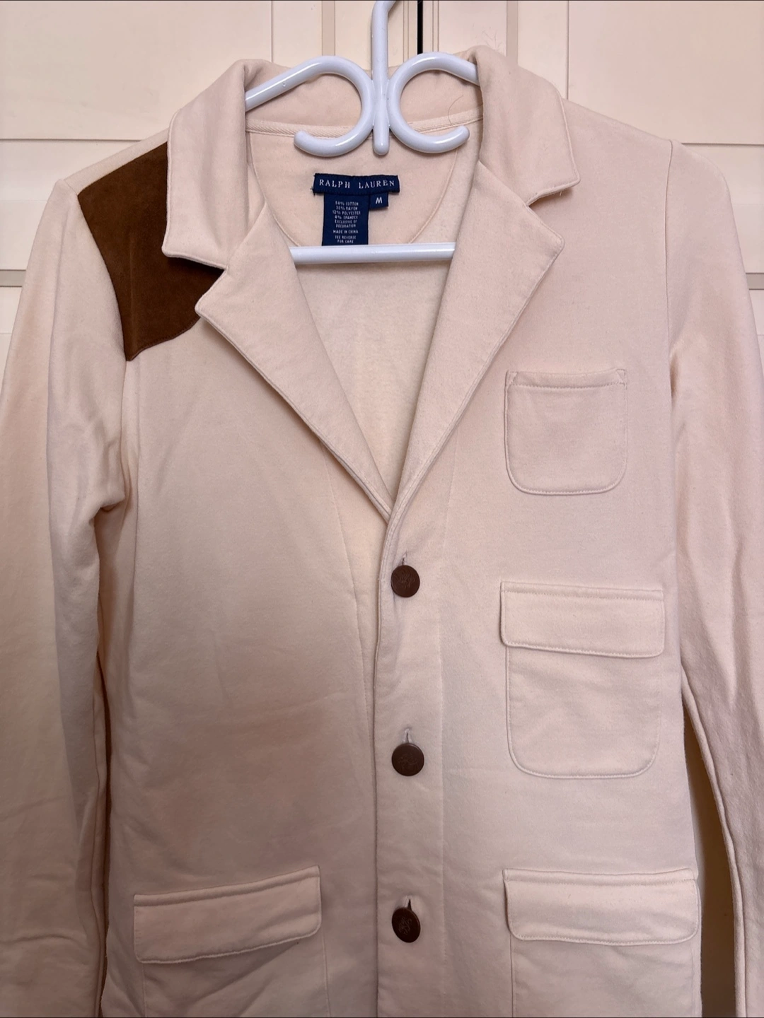 Women's Ralph Lauren blazer. Size medium. Cream colour. Features suede-like shoulder patches and multiple pockets. Made in China. 54% cotton, 30% rayon, 12% polyester, 4% spandex.