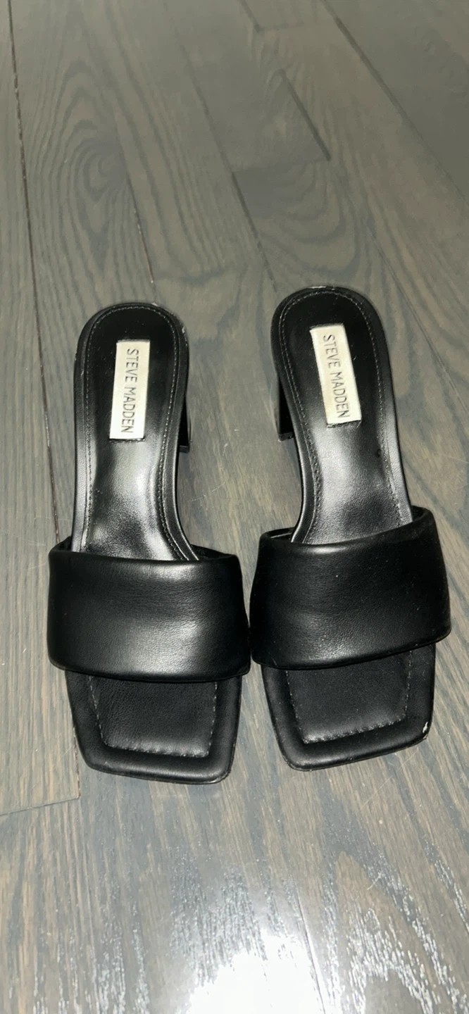 These Steve Madden mules are black with a comfortable block heel. They're a stylish slip-on design. Perfect for dressing up an outfit! Size 7 women’s.