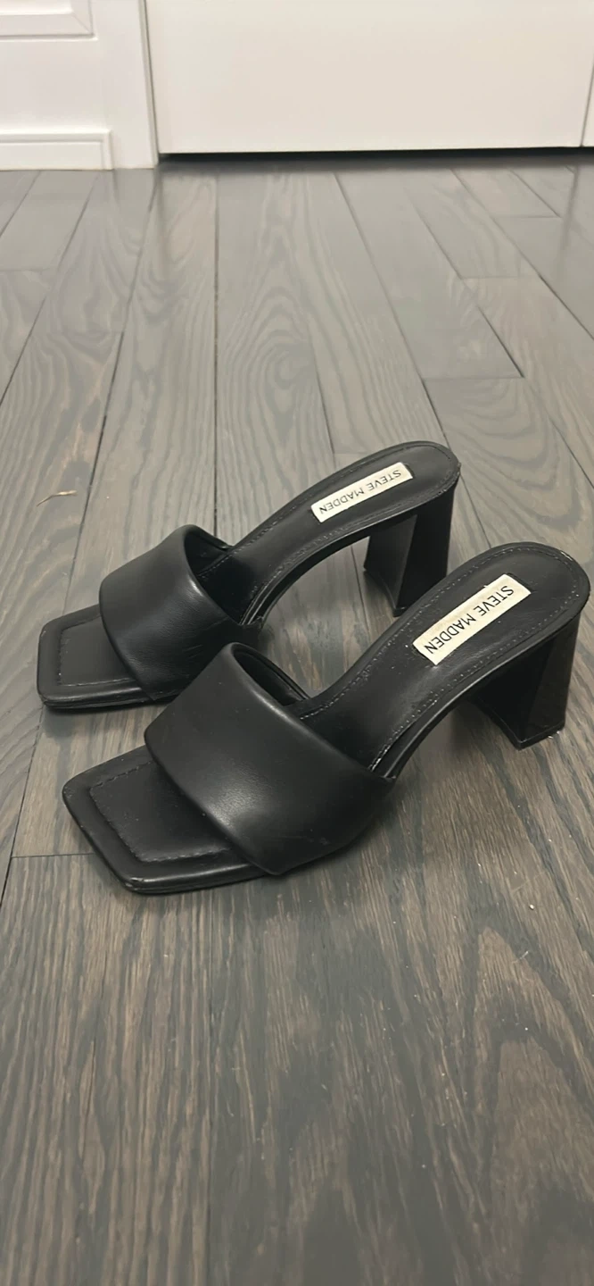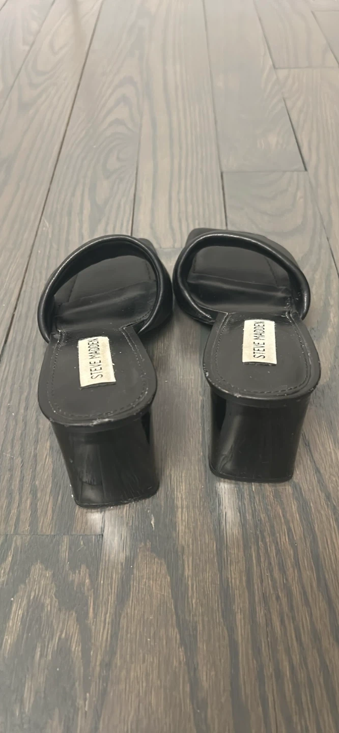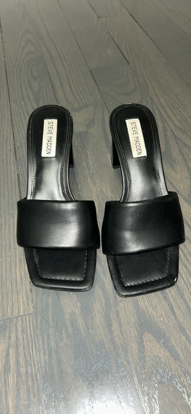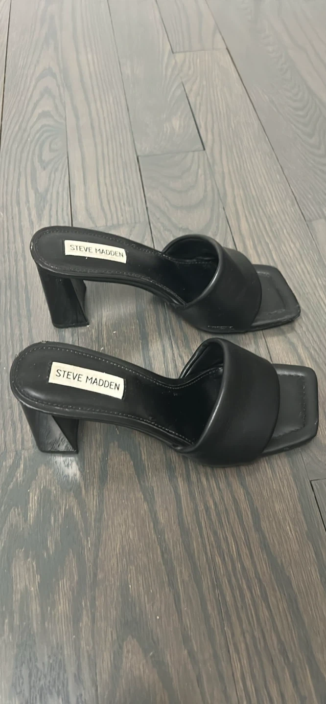 These Steve Madden mules are black with a comfortable block heel. They're a stylish slip-on design. Perfect for dressing up an outfit! Size 7 women’s.