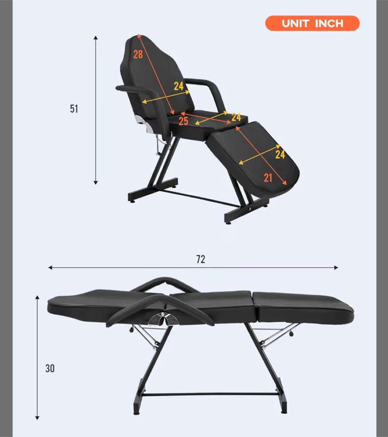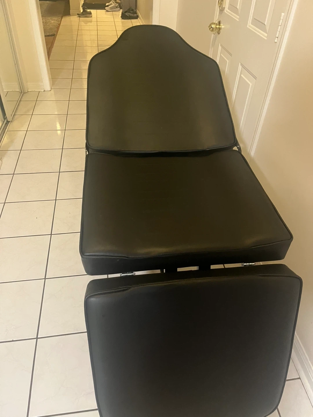 This is a faux leather massage table in black. It's adjustable with a removable headrest and armrest. The table is sturdy and comfortable.
