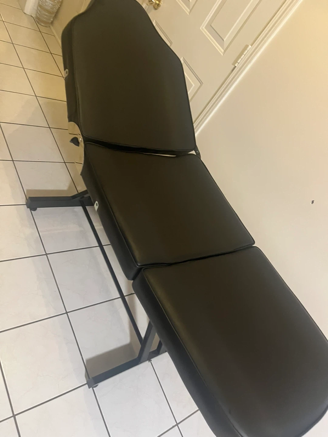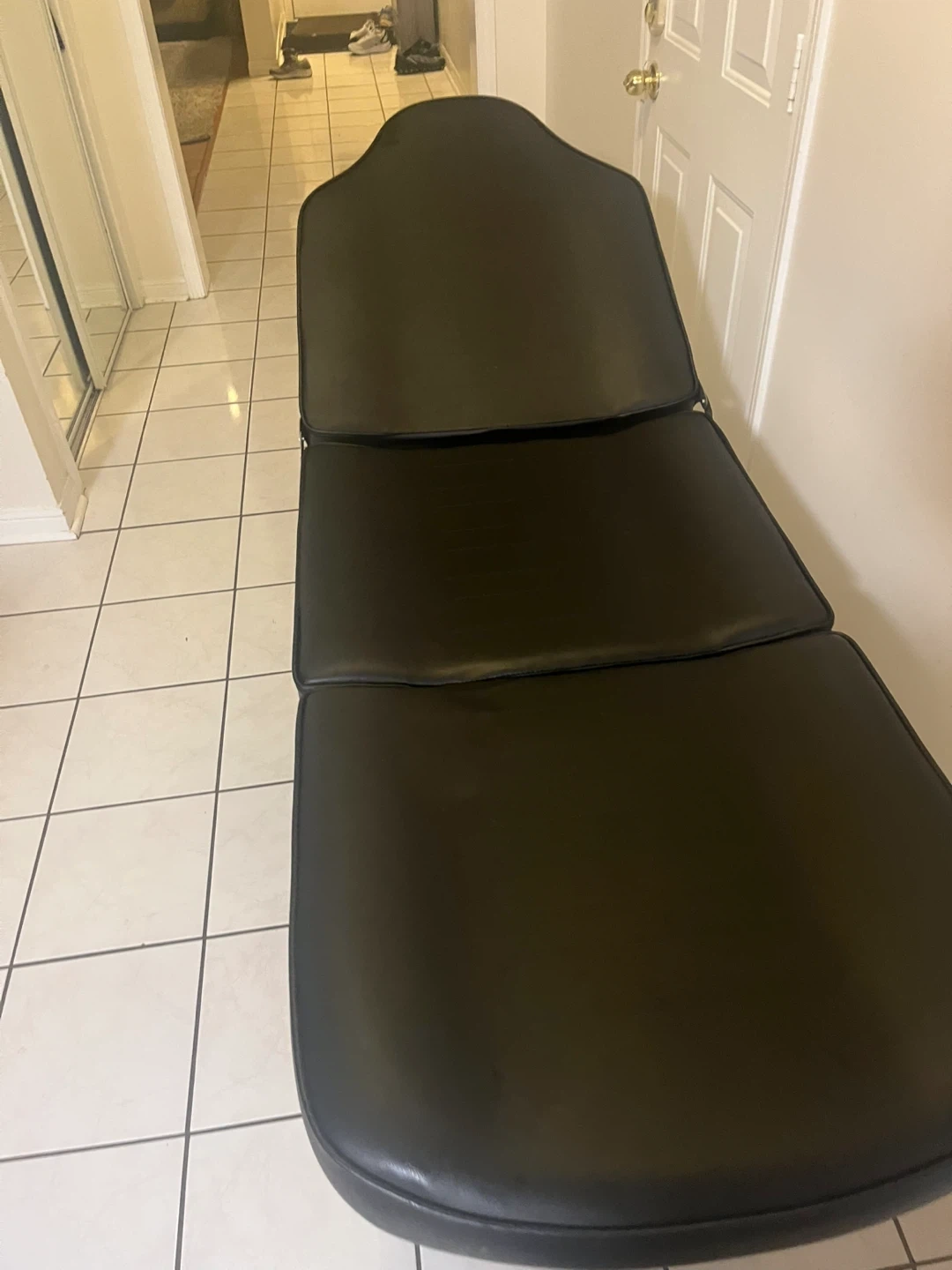 This is a faux leather massage table in black. It's adjustable with a removable headrest and armrest. The table is sturdy and comfortable.