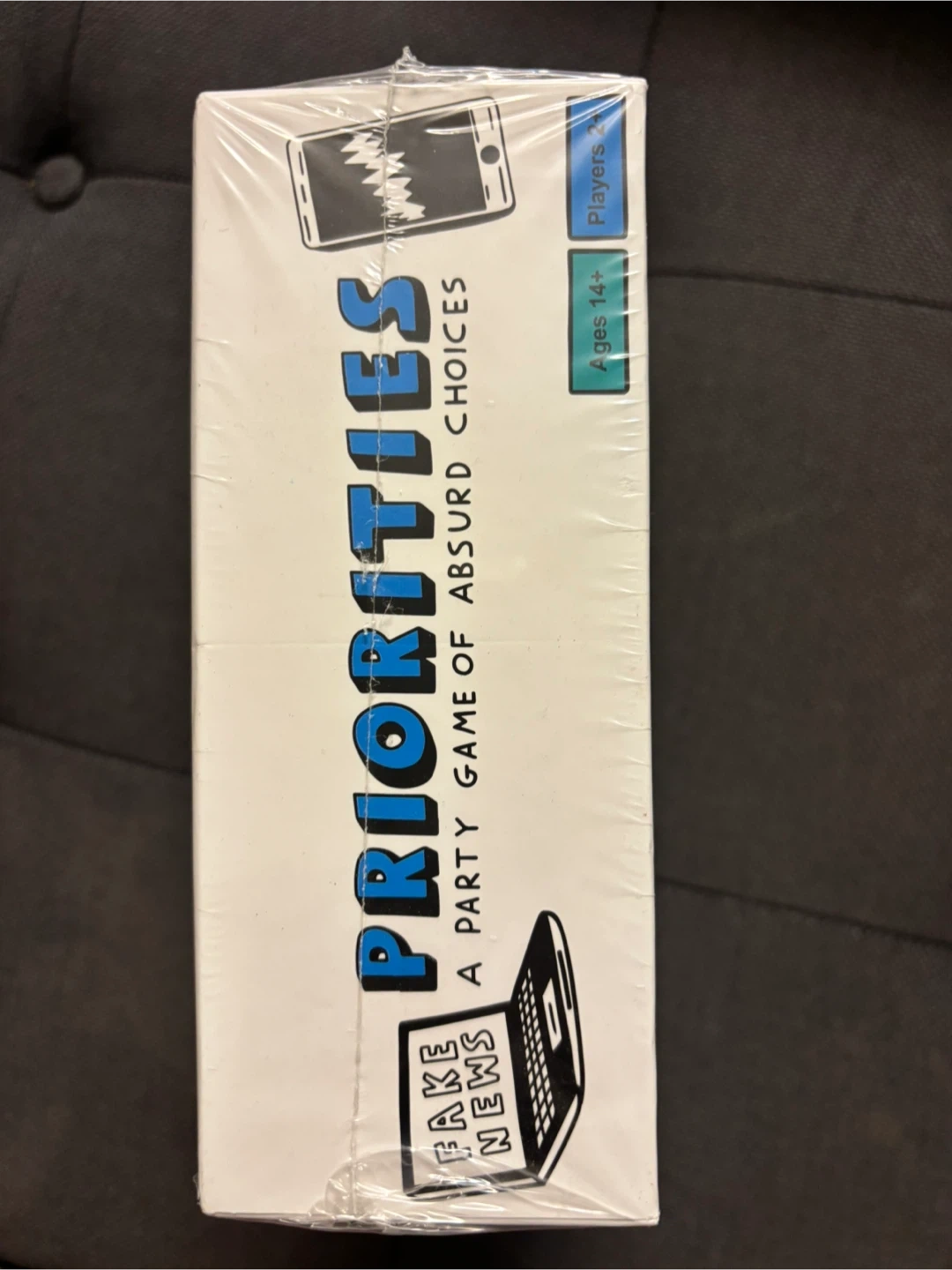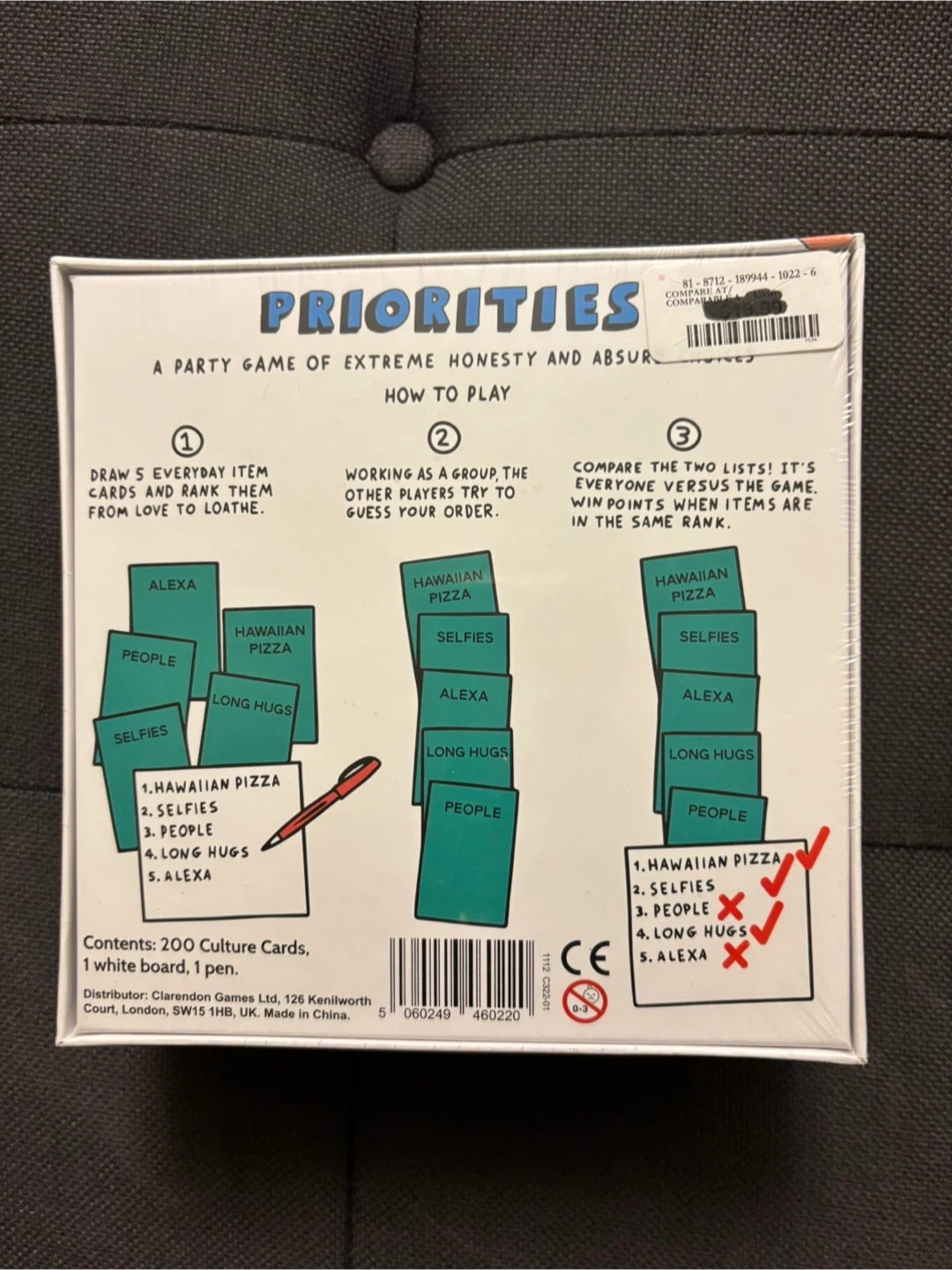 This is the board game 'Priorities: A Party Game of Absurd Choices'. It includes 200 Culture Cards, 1 whiteboard, and 1 pen. It's suitable for ages 14 and up.