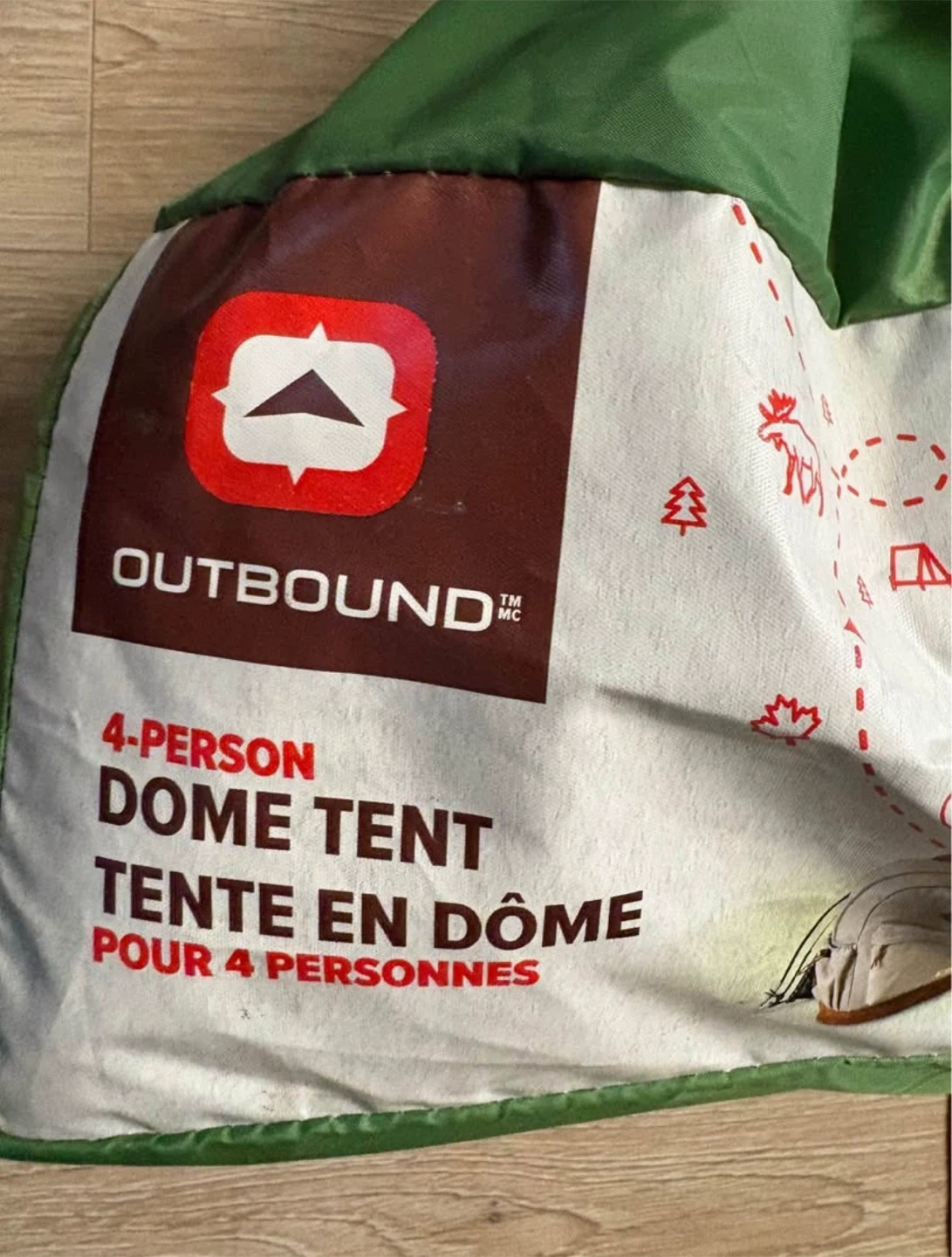 60Selling an Outbound 4-person dome tent in great condition! It's green and perfect for camping trips. The tent is lightweight and easy to set up. Includes all components and the original box too