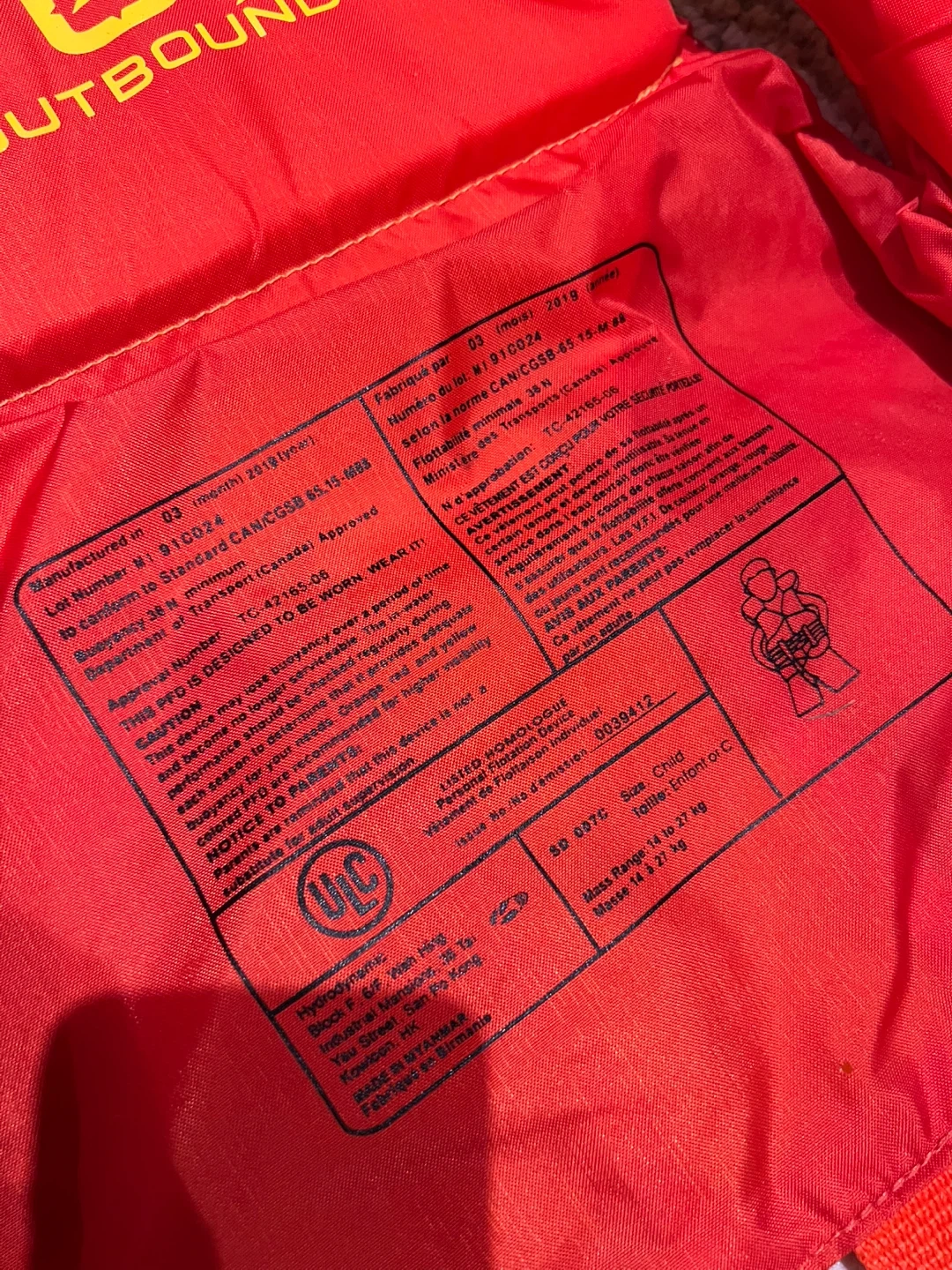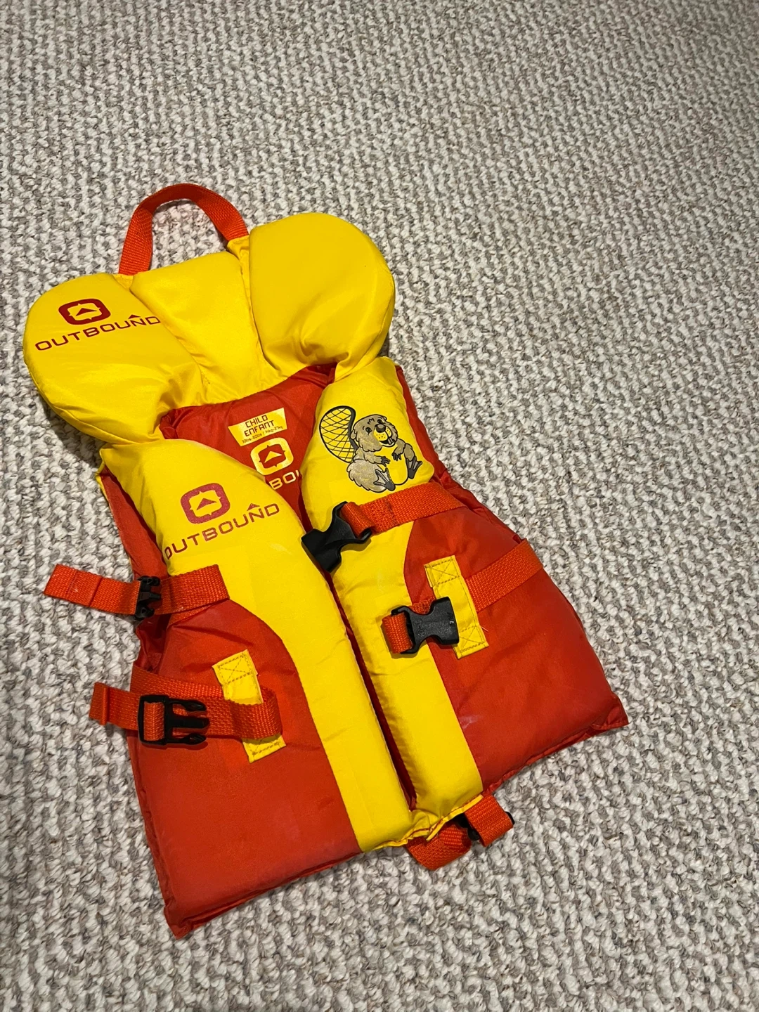 Selling an Outbound child's life jacket, perfect for keeping your little one safe on the water! - Designed for children weighing 30-60lbs (14-27kg) - Approved to conform to Canadian standards - Bright orange and yellow for increased visibility