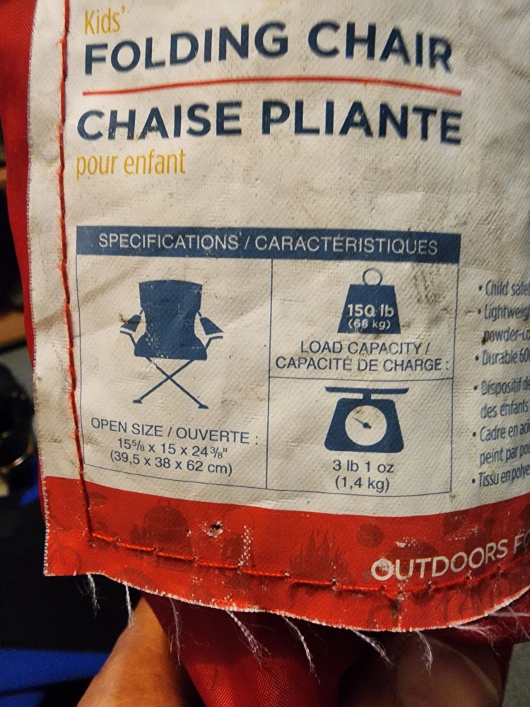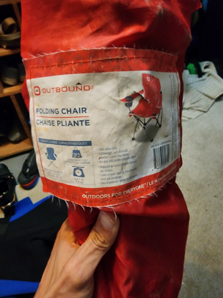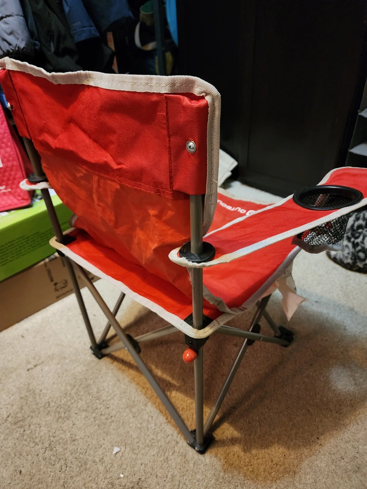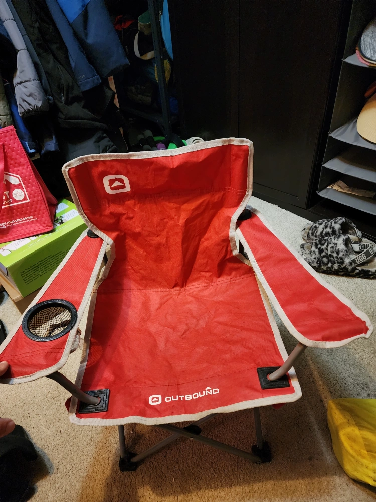 Here's a gently used Outbound Kids' Folding Chair, perfect for camping or backyard fun! It's lightweight and easy to carry. The chair features a child safety lock and a durable, rust-resistant, powder-coated steel frame. It can hold up to 150 lb (68 kg). Open size is 15 1/2" x 15 x 24 3/8" (39,5 x 38 x 62 cm).