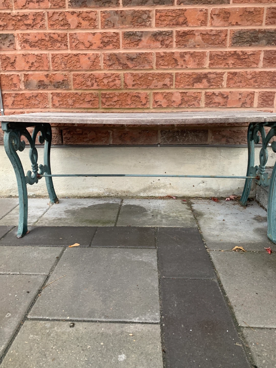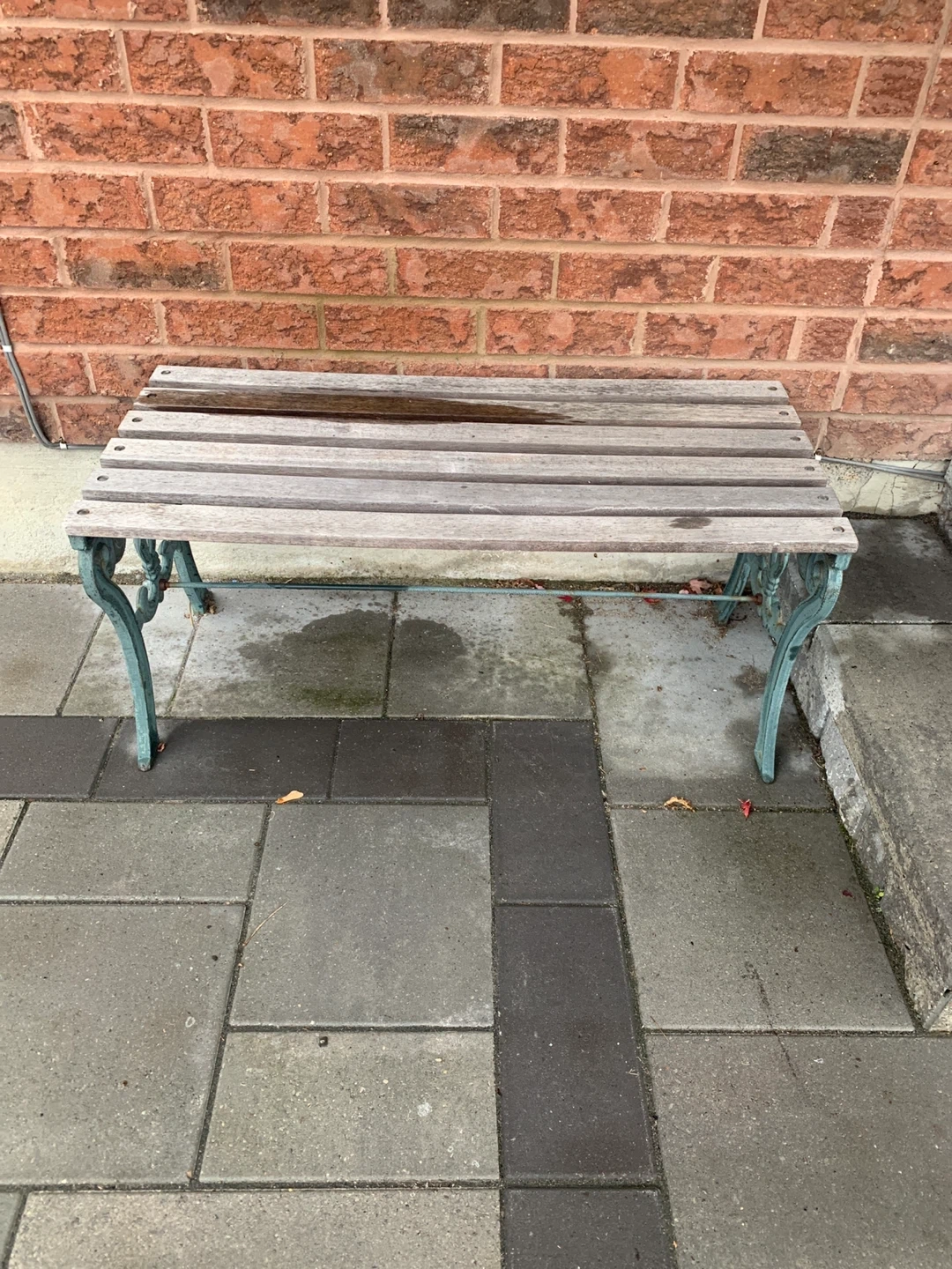 15Selling a sturdy outdoor bench. It's perfect for a garden or patio setting! It has a wooden top and metal legs. It has some signs of wear. Easily refurbish-able.