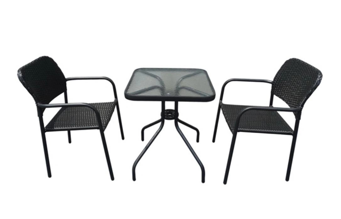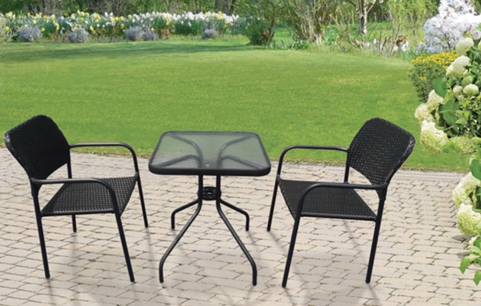 Bistro Patio Set - Steel and Resin - Black - 3 Pieces. This Patio set features a steel frame for durability and a resin wicker design that is easy to care for and resists the elements. The bistro set includes two chairs and a table with a tempered glass top for safety. This can be used as dining table indoors for a couple. Great choice for balconies and other smaller spaces. Chair Type: Conversation Chair Dimensions: 22 x 23.2 x 33.4 inches Chair Material: Steel Coffee Table Dimensions: 23.6 x 23.6 x 28.2 Recently purchased, looks like new only. Selling as we are moving back.