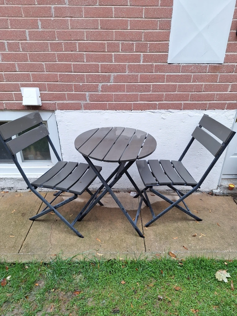 254Selling a cute outdoor bistro set that includes a small round table and two folding chairs! It's perfect for a small patio or balcony. The set is in good condition and ready for you to enjoy your morning coffee or evening drinks outside.