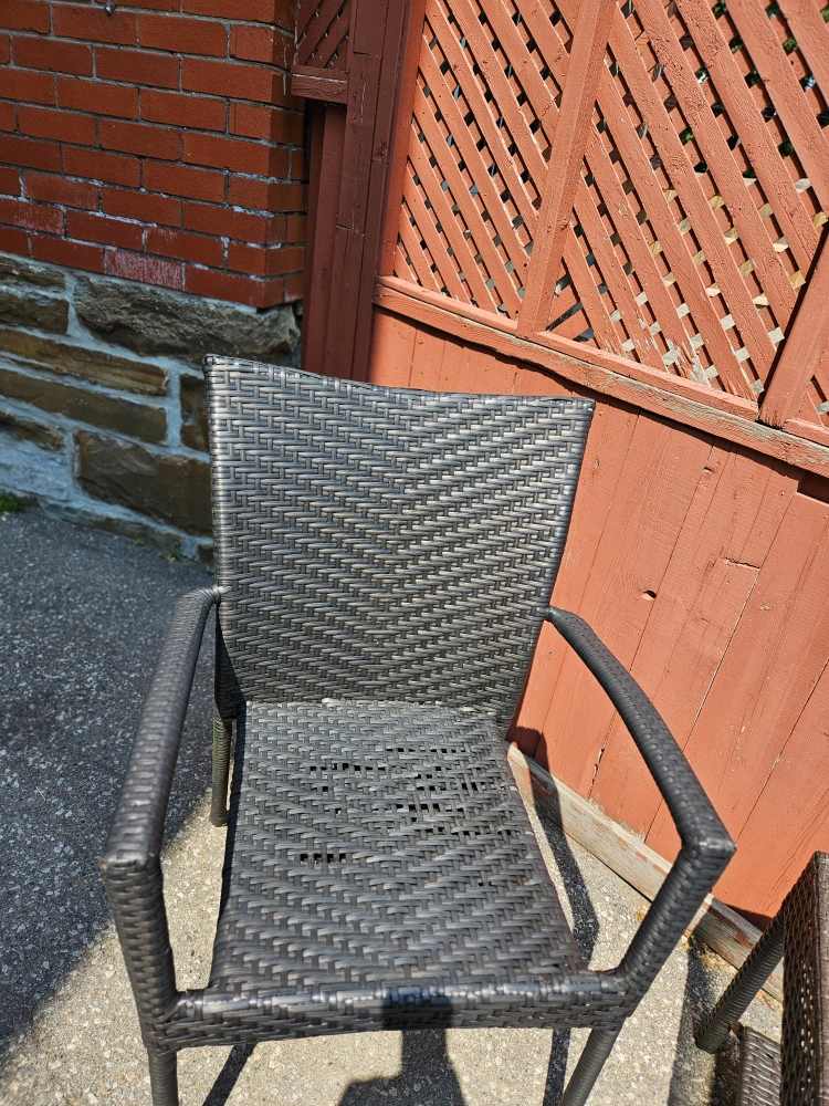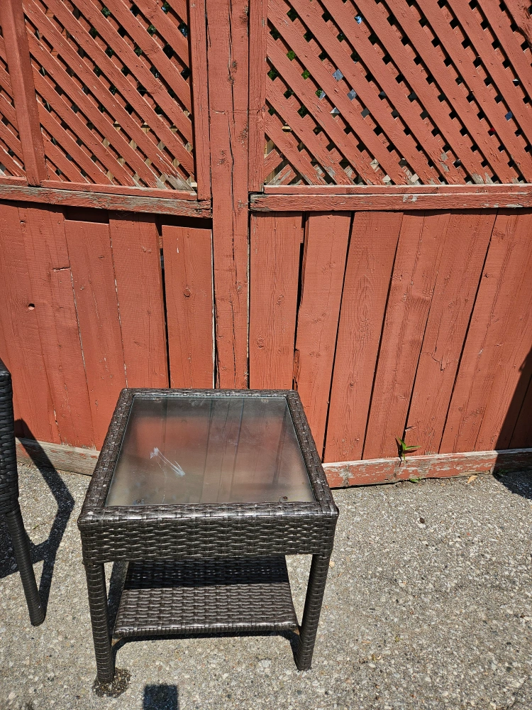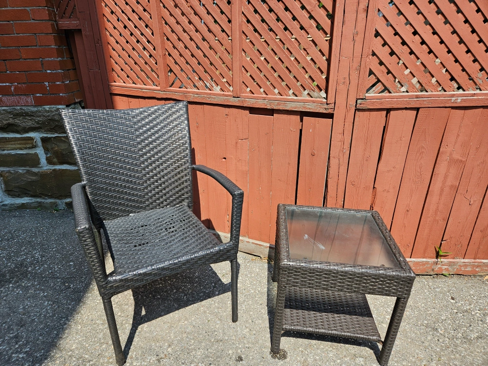 A sturdy chair with armrests. Featuring a matching square side table. Perfect for a calm afternoon reading a book or simply relaxing outside.