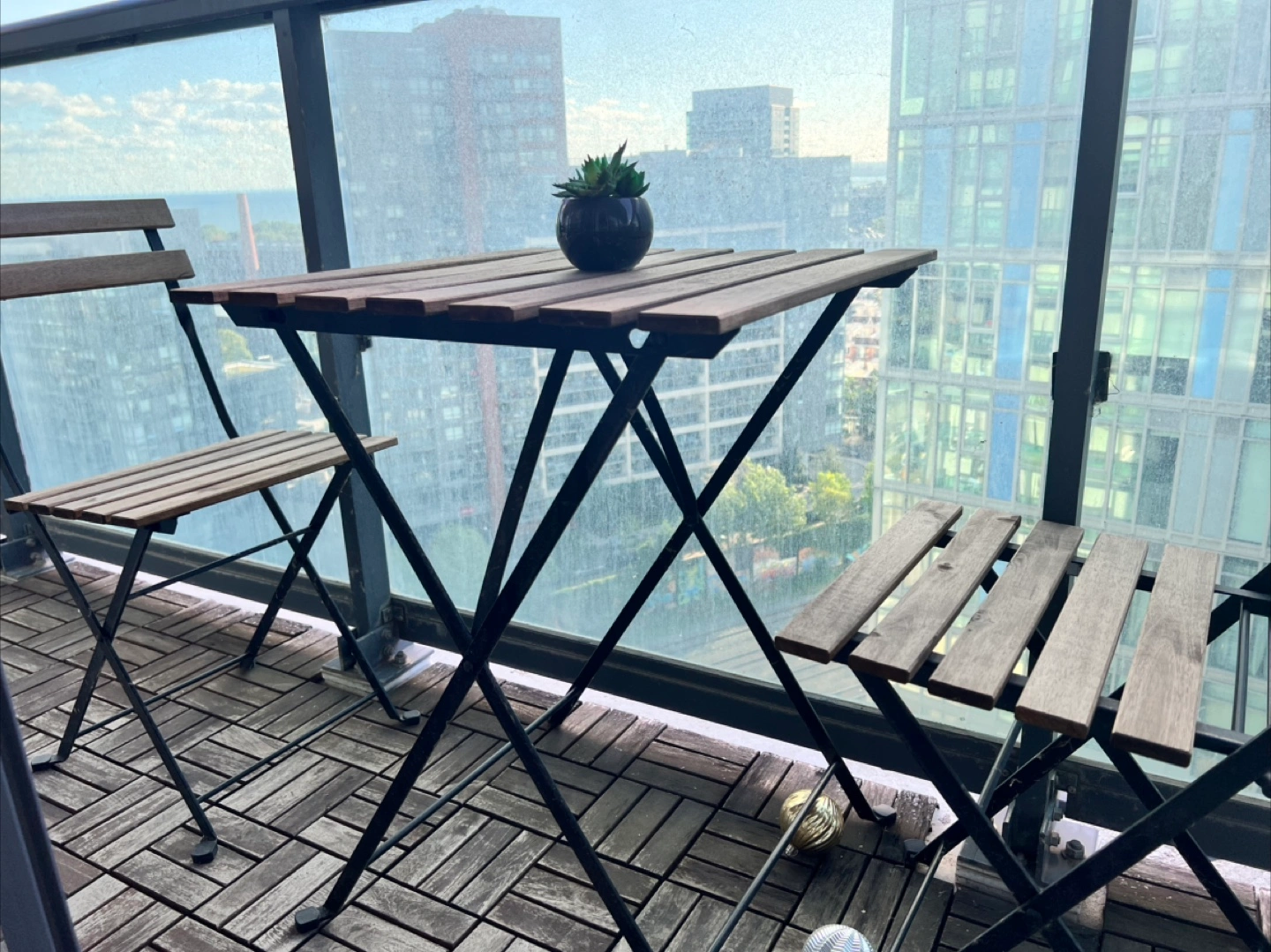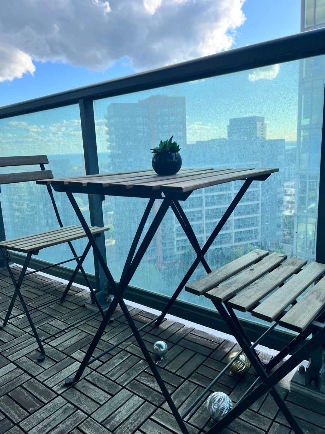 Selling a cute outdoor folding bistro set (IKEA - Tarno)! Perfect for a small balcony or patio. The set includes a table, two chairs and 2 red seat cushions, all with a folding design for easy storage. Great for enjoying your morning coffee or a nice evening drink outdoors