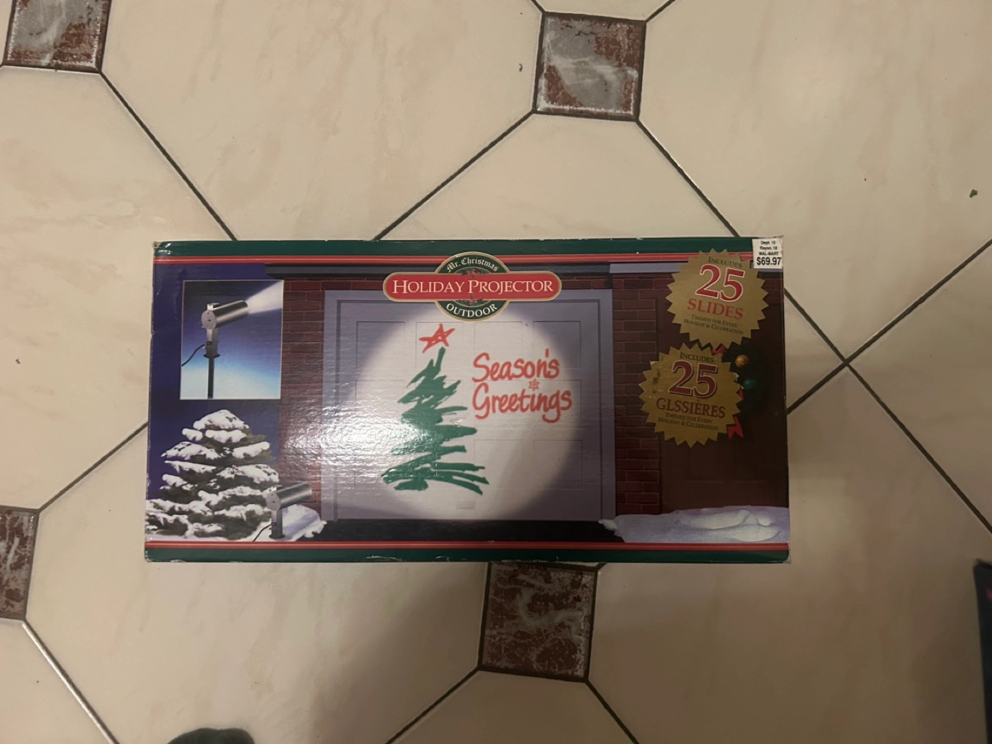 1000+Outdoor holiday projector. Includes 25 interchangeable slides for various holidays. Great for projecting images onto your house or garage. Was only ever used indoors a couple of times for new years