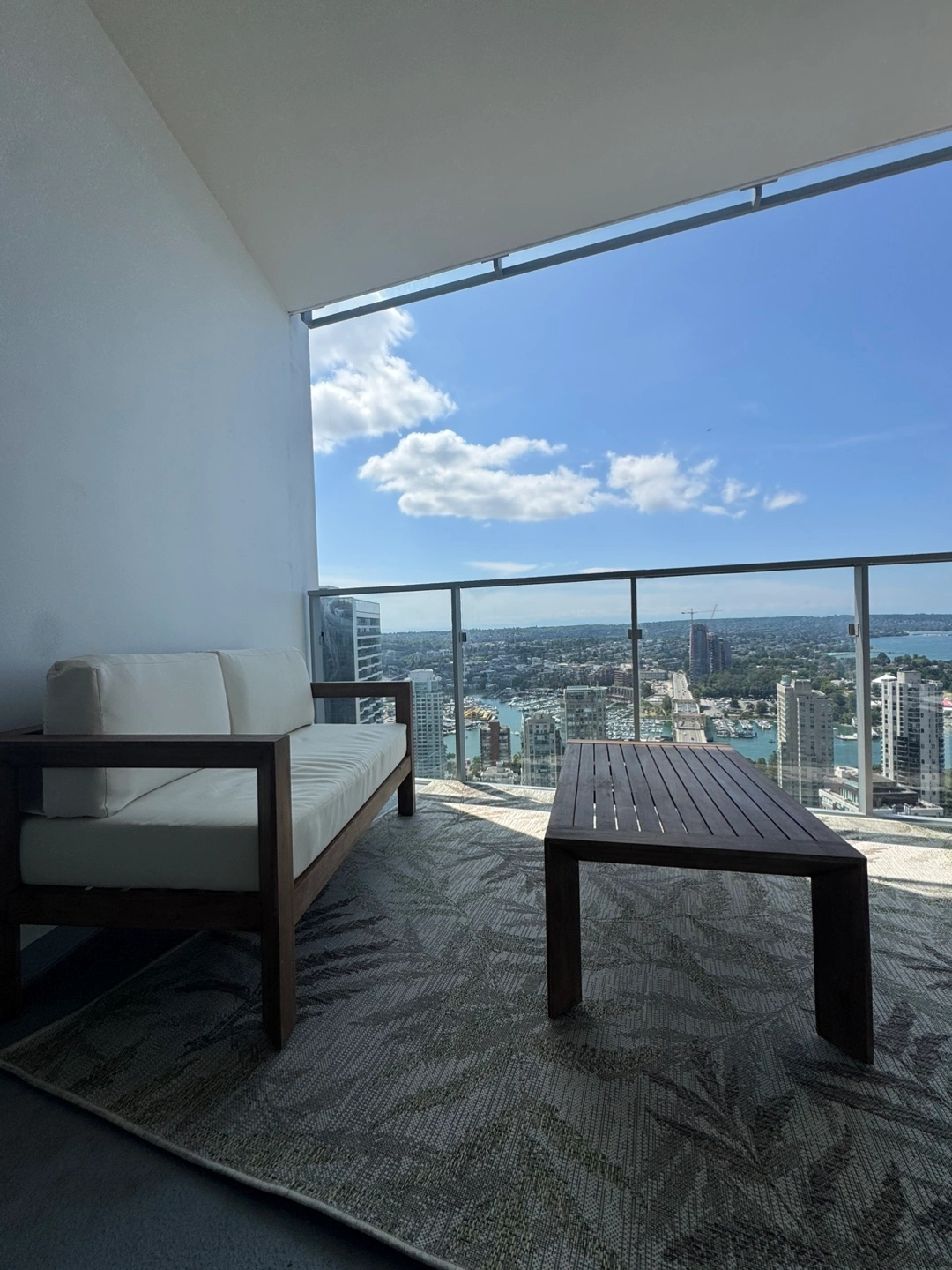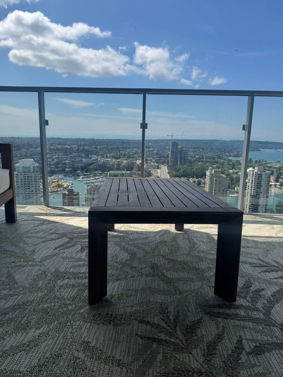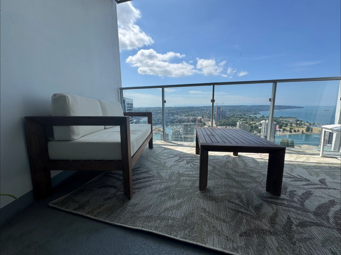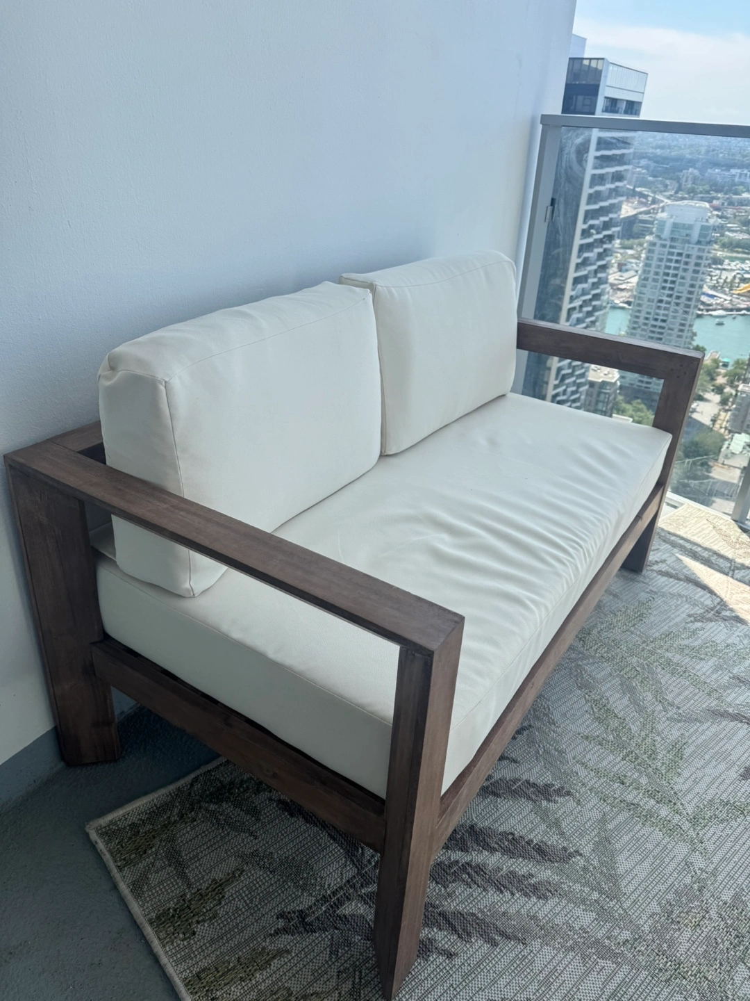 Selling an outdoor loveseat with white cushions. It's in great condition and perfect for a balcony or patio - Selling to get a bigger one Love seat dimensions L: 55" D: 27.5" H: 24.5" Table Dimensions L: 24.5" H: 16"