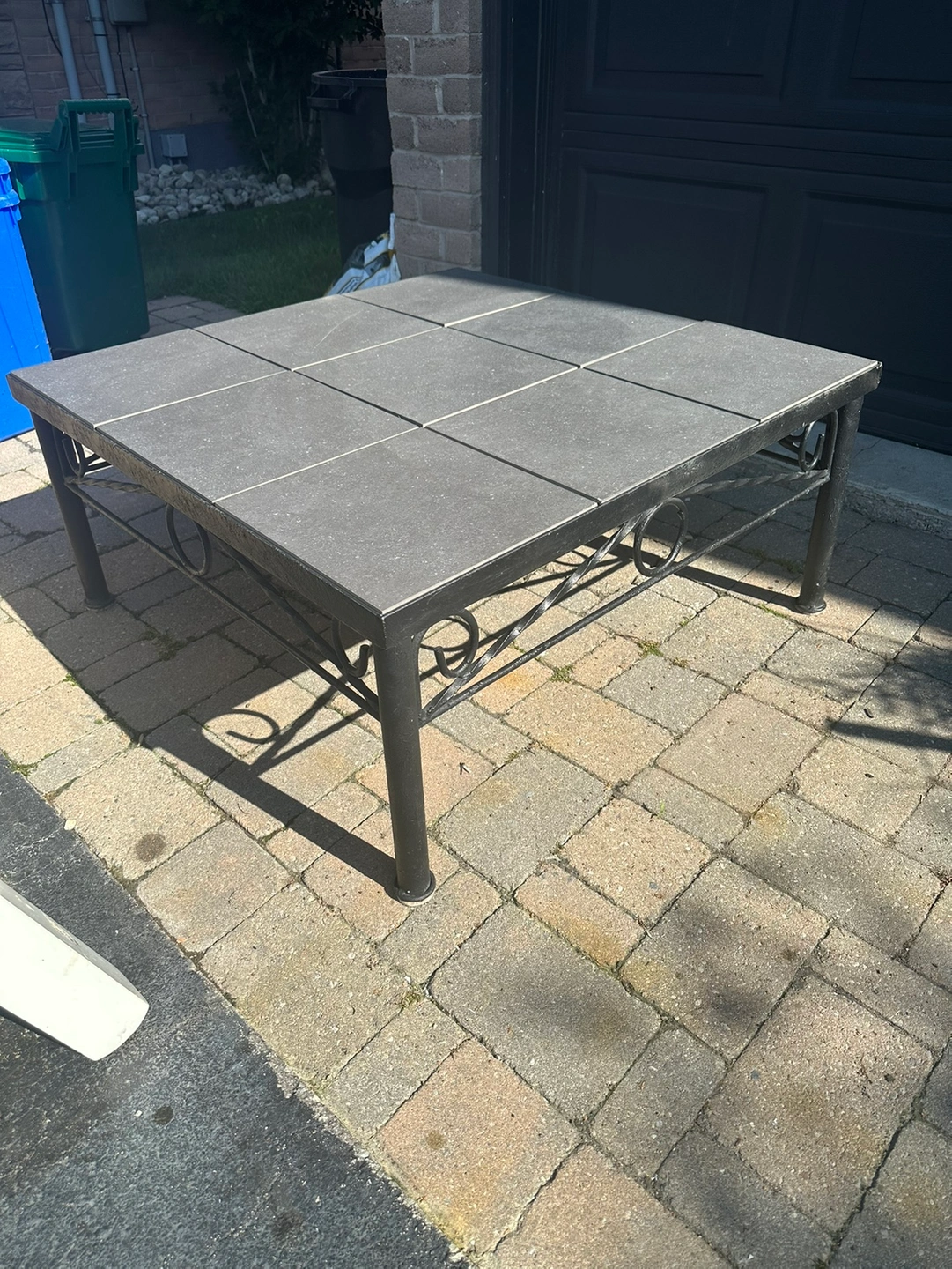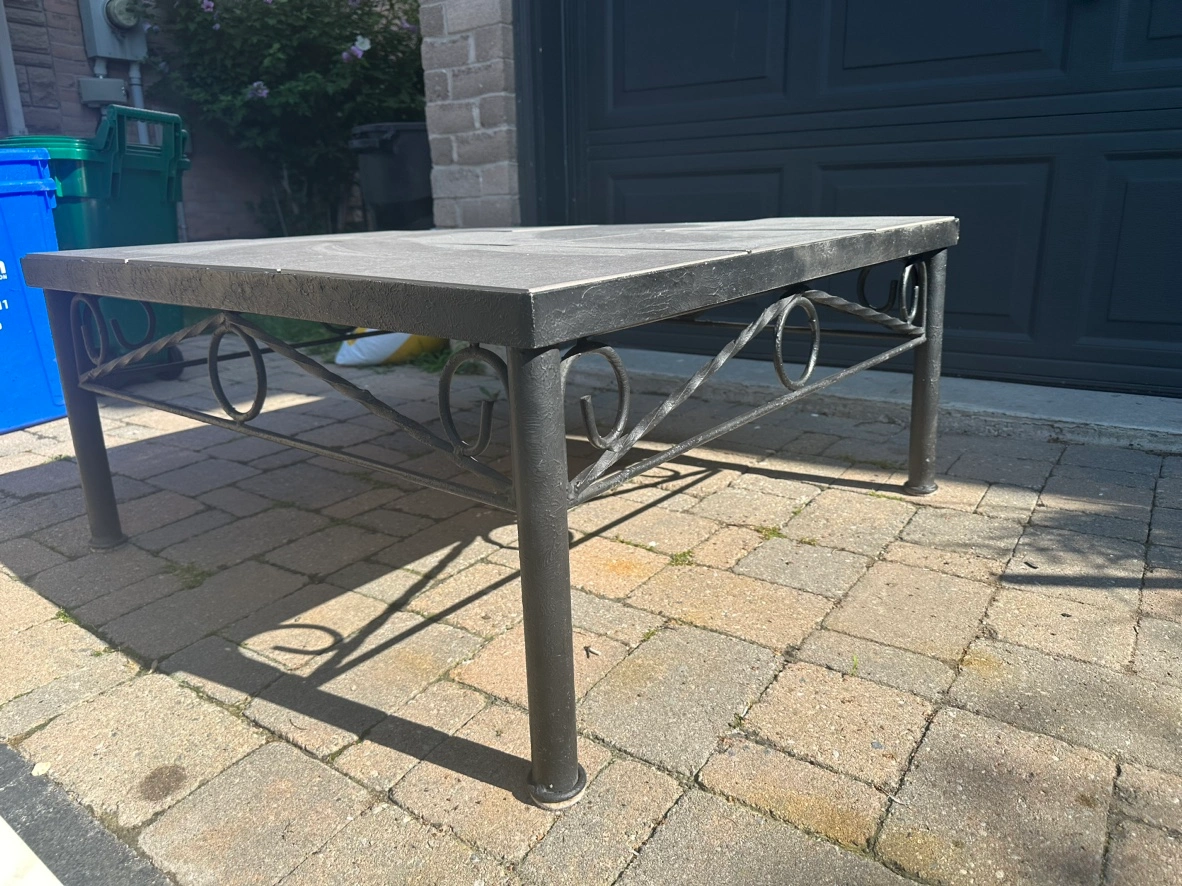 Outdoor patio table. Rod-iron base with ceramic top. Very sturdy. Great condition. Downsizing and no longer need. Dimensions: 36” x 36” x 17”