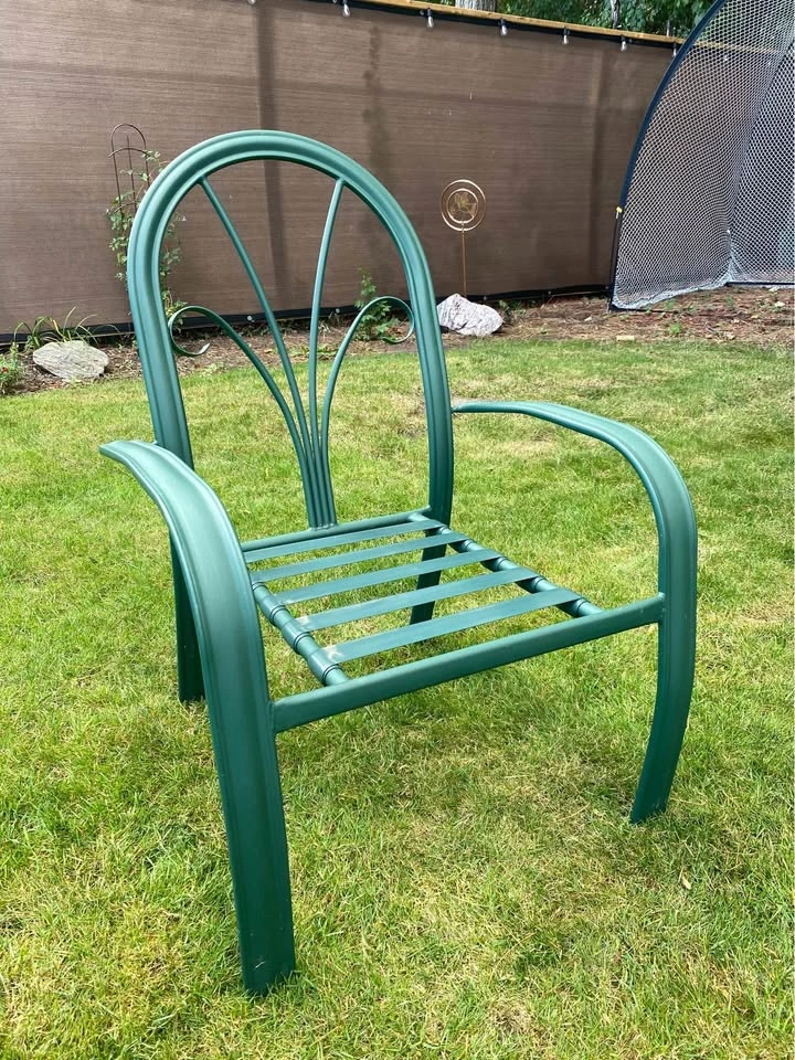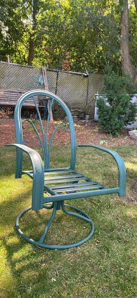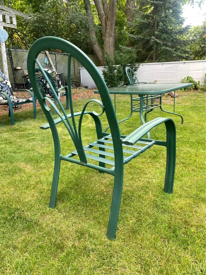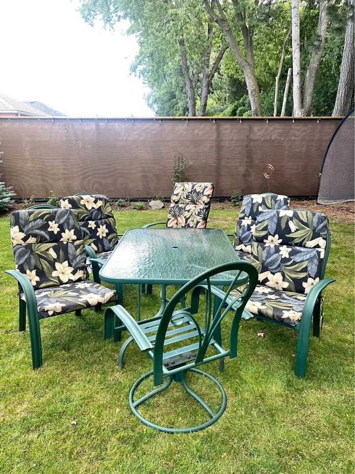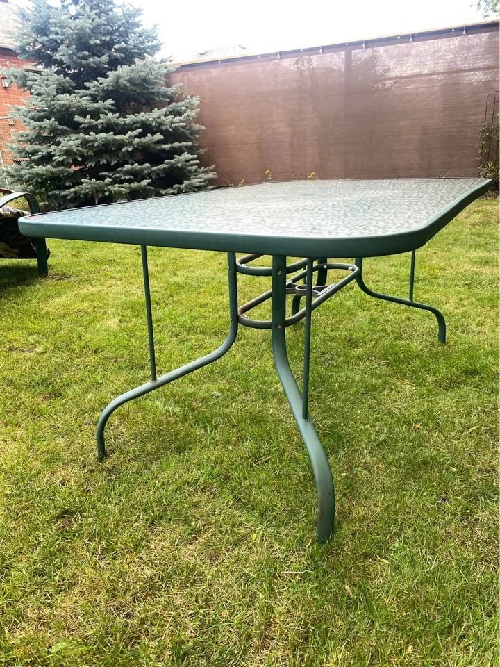 7 piece metal outdoor dining set Includes: - Glass top table with hole from an patio umbrella (60” x 38” x 27”) - 4 standard chairs (stackable) - 2 swivel chairs - 5 removable cushions Pick up only, near Kennedy & St Clair