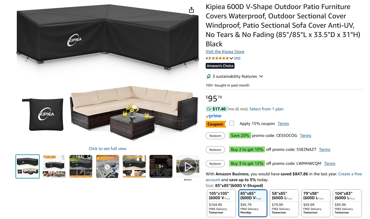 754Kipiea 600D V-Shape Outdoor Patio Furniture Covers Waterproof, Outdoor Sectional Cover Windproof, Patio Sectional Sofa Cover Anti-UV, No Tears & No Fading (85"/85"L x 33.5"D x 31"H) Black, Brand New in the Box/Sealed Sells for $95+tax on Amazon https://www.amazon.ca/dp/B0D5HCL6P2 Features: ăKipiea 600D Outdoor Sectional Coveră Do you want to protect your valuable garden furniture from the elements with the highest quality covers? Kipiea patio sectional covers are made of 600D high-density fabric with a premium double-layer PU Waterproof coating, will protect your furniture from any bad environment like the sun, rain, snow, dirt, bird droppings, etc ăTear and UV Resistance ă The Kipiea v shape patio furniture cover is made from high-density 248GSM heavy-duty 600D Oxford fabric, offering superior tear resistance compared to 420D and 500D fabric. Also, our outdoor couch cover features a UV-resistant coating that blocks 99.99% of UV rays, protects it from tearing and fading, and keeps your furniture looking new ăUpgraded 100% Waterproofă Kipiea outdoor sectional covers feature advanced waterproof technology that allows the outdoor sofa covers to withstand water pressures up to 200,000+ Pa. Our patio sectional sofa cover uses double premium PU coatings and high-quality waterproof tape at the seams to prevent water from seeping through the covers and to keep your outdoor furniture dry ăSuperior Windproofă Our l shape patio furniture covers waterproof come with 6 sturdy windproof buckles and 2 reinforced adjustable drawstring lock buckles. The buckles can support more than 176 pounds of force. Tightening the buckles ensures the outdoor couch cover has excellent windproof performance in harsh weather conditions, which is much better than others ăYour Great Shopping Experienceă Kipiea v shape outdoor furniture covers waterproof and provide valuable protection for your furniture investment. We offer a 3-year replacement and 24-hour friendly customer service. If you have any questions, please don't hesitate to ask us for assistance