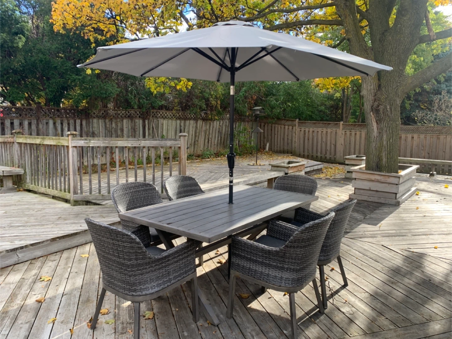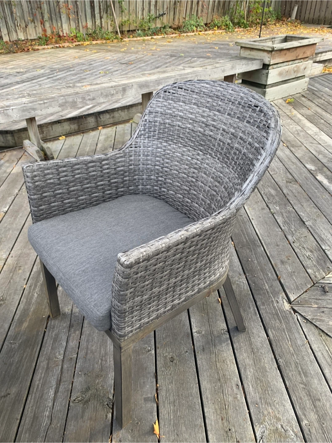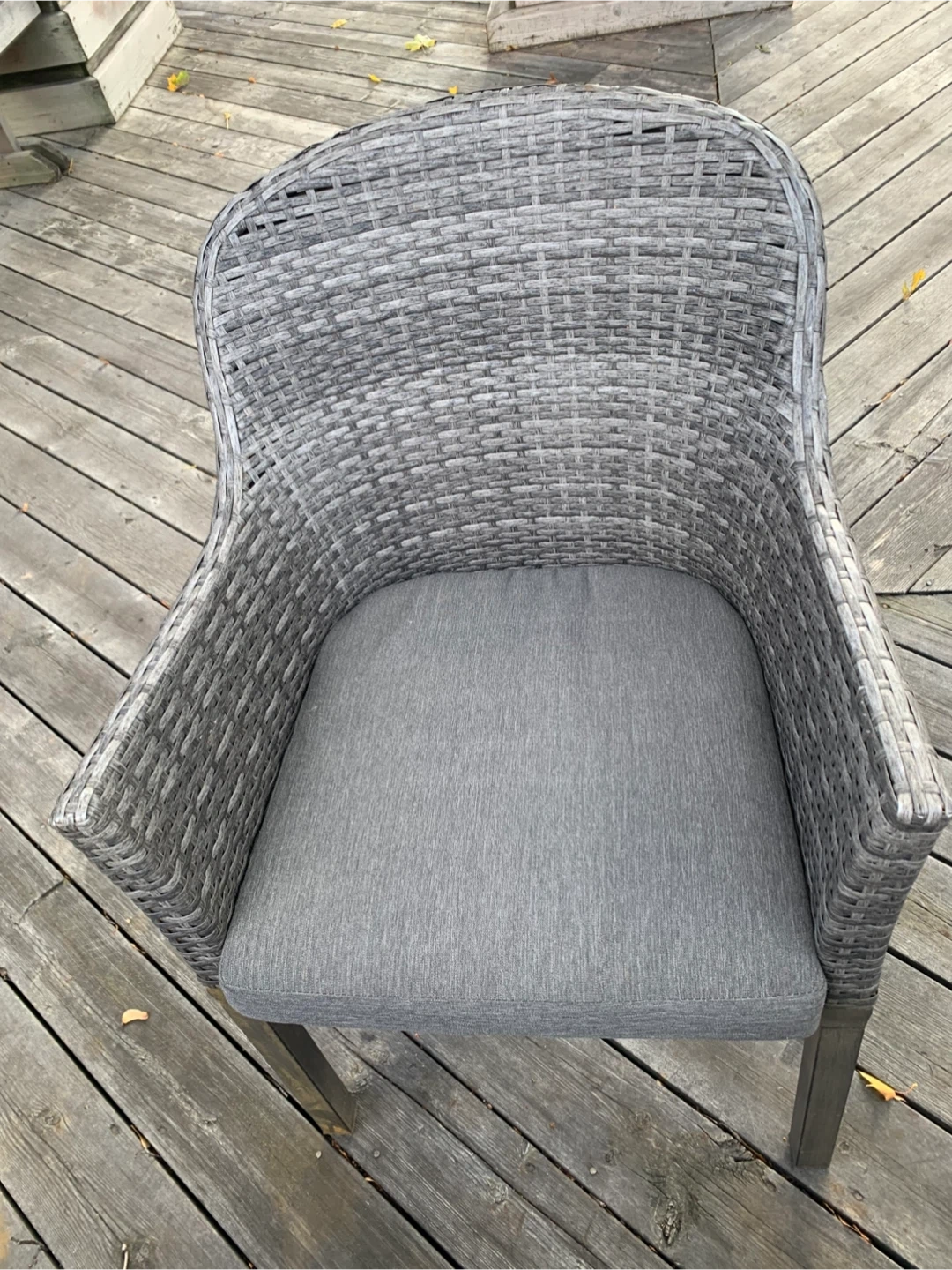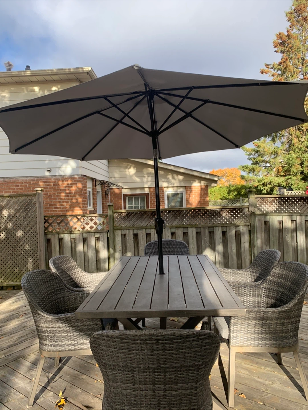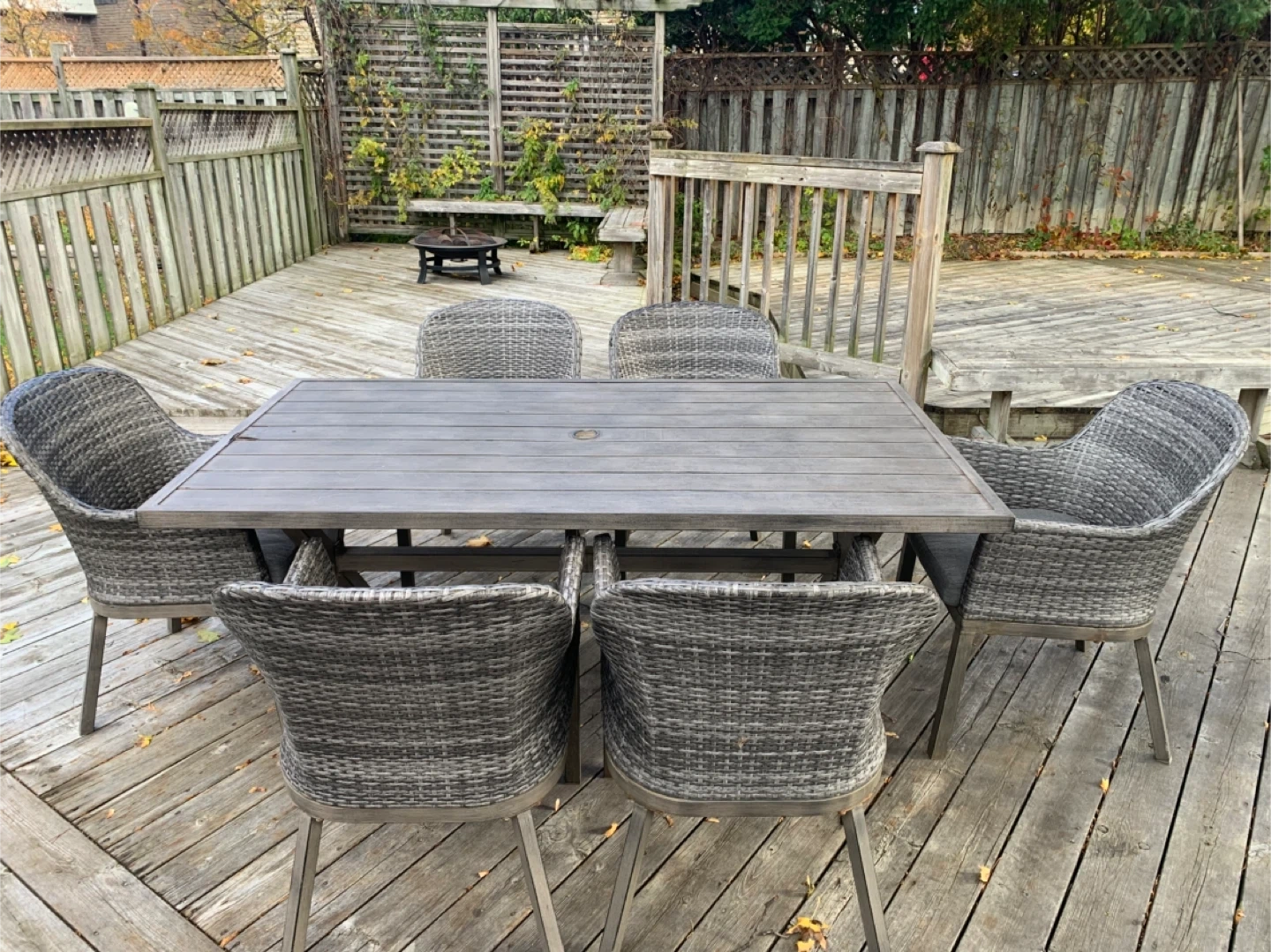 13This used outdoor patio furniture set, featuring a dining table, six chairs, and an umbrella. The set has a modern design with woven wicker chairs. There are some signs of rust on it (show in the picture). Key features: * Rectangular dining table * Seats six comfortably * Includes umbrella for shade