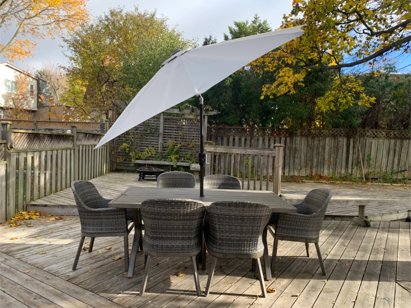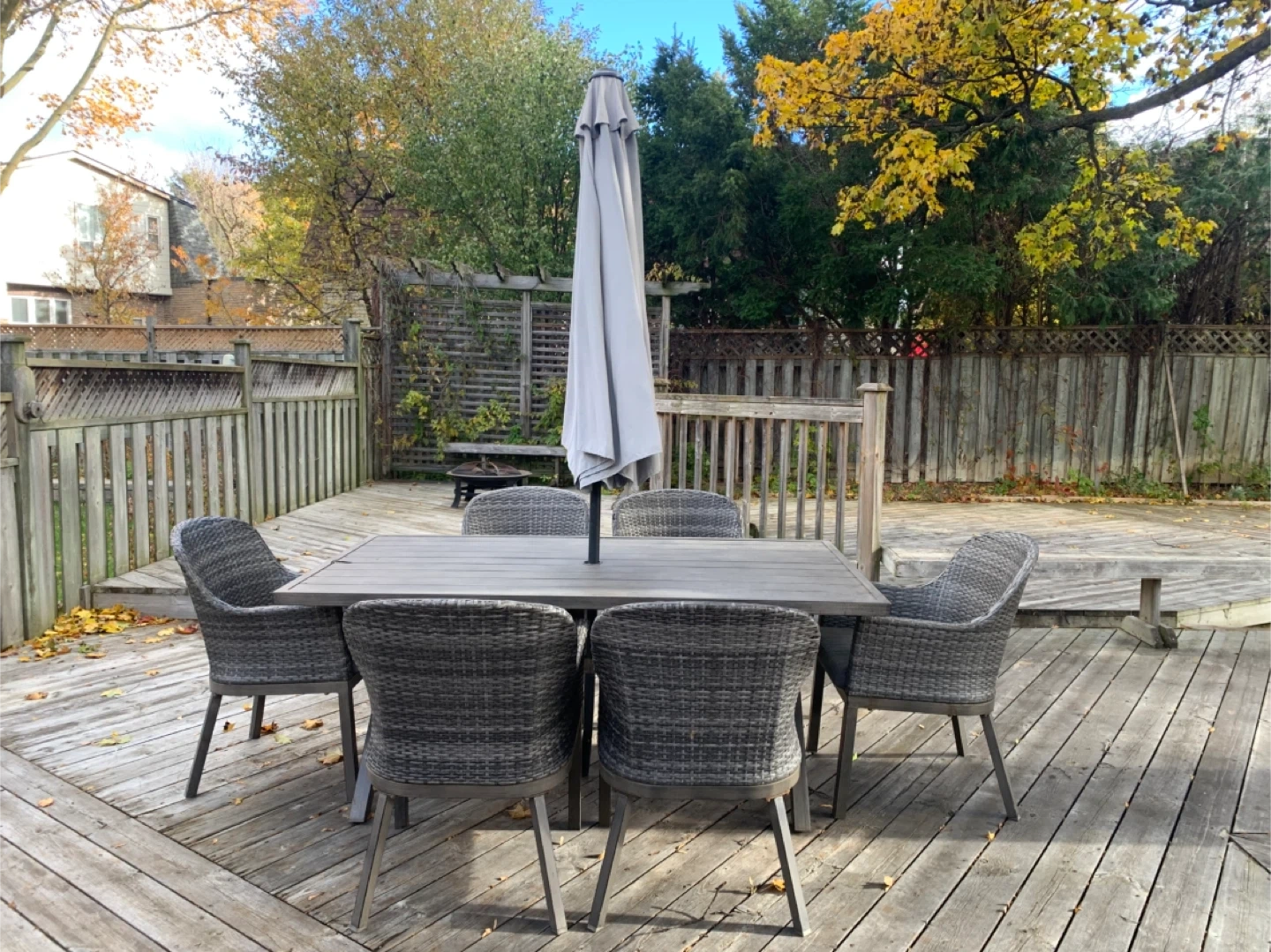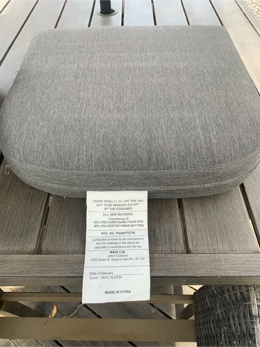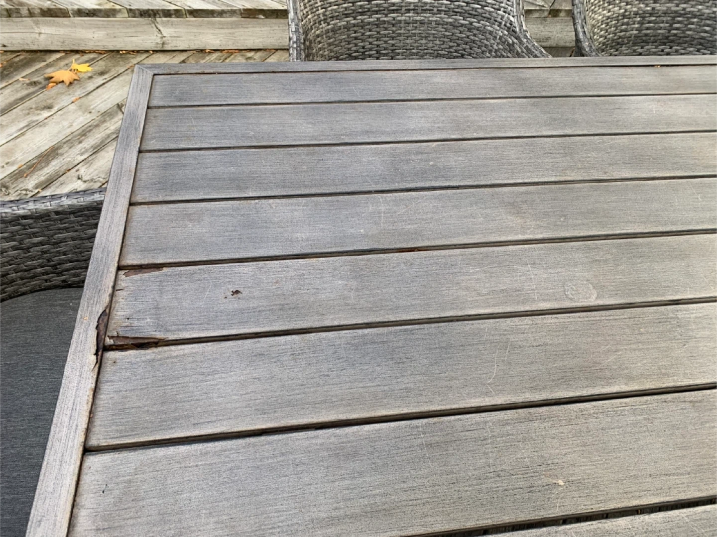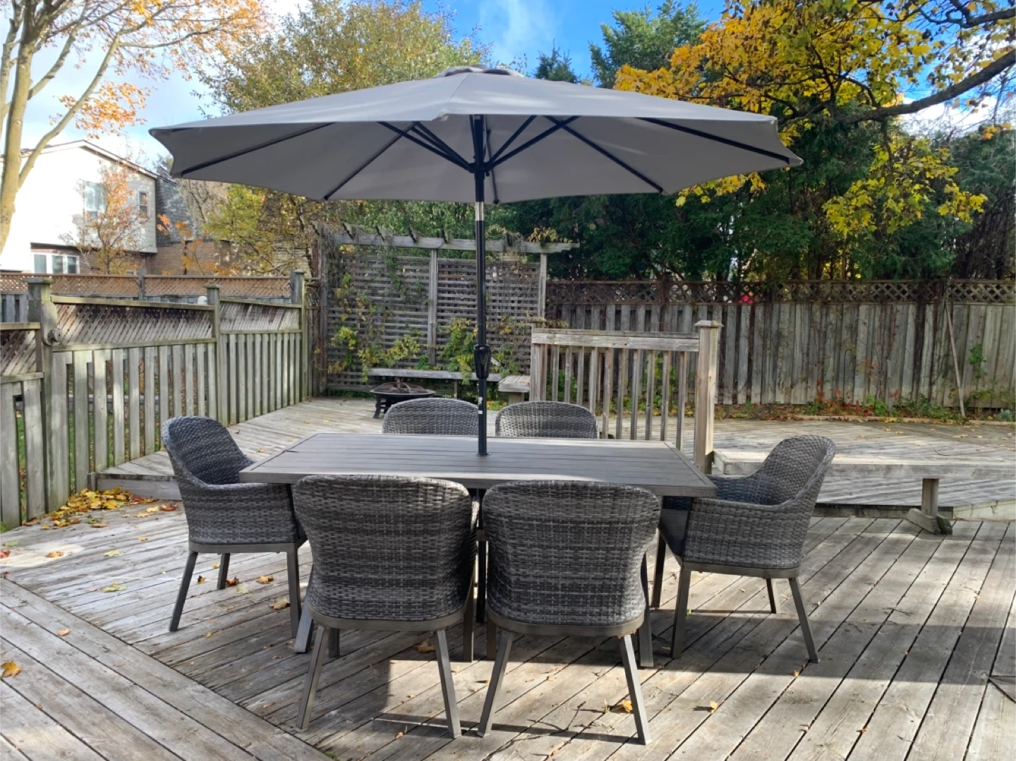 13This used outdoor patio furniture set, featuring a dining table, six chairs, and an umbrella. The set has a modern design with woven wicker chairs. There are some signs of rust on it (show in the picture). Key features: * Rectangular dining table * Seats six comfortably * Includes umbrella for shade