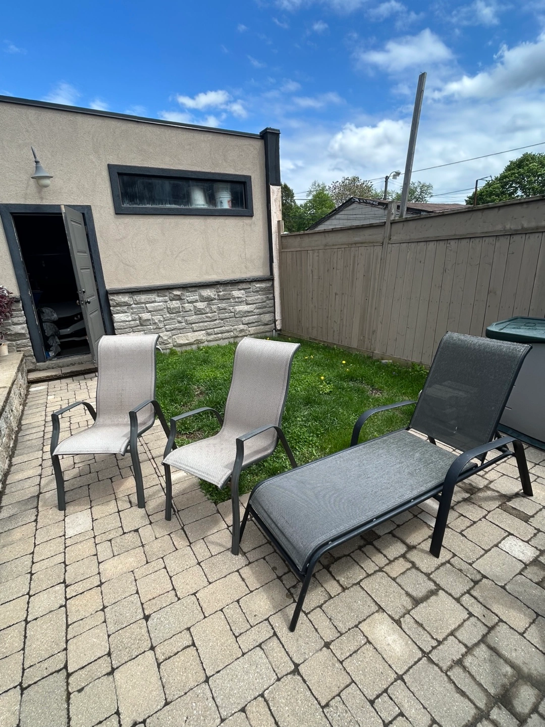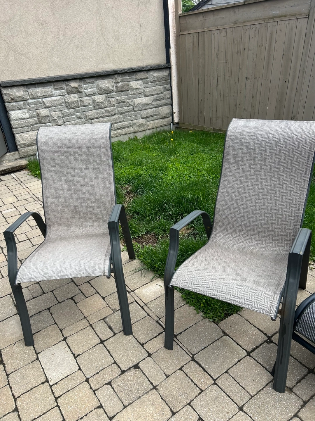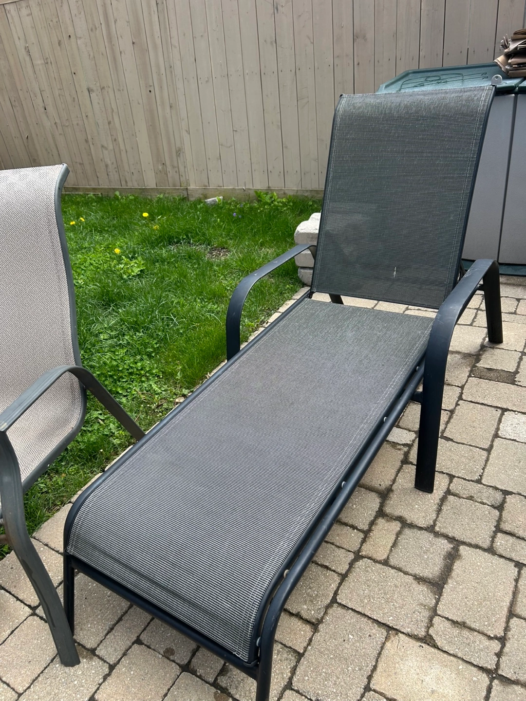 Relaxing outdoor patio furniture set. Includes one lounge chair and two armchairs. Metal frame, sling fabric. Great for lounging and entertaining. Used condition. $40 for lounge chaise $20 for both chairs