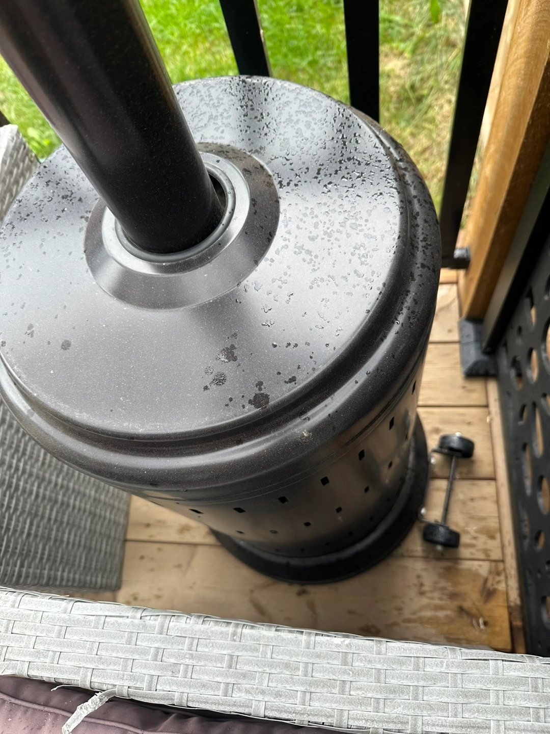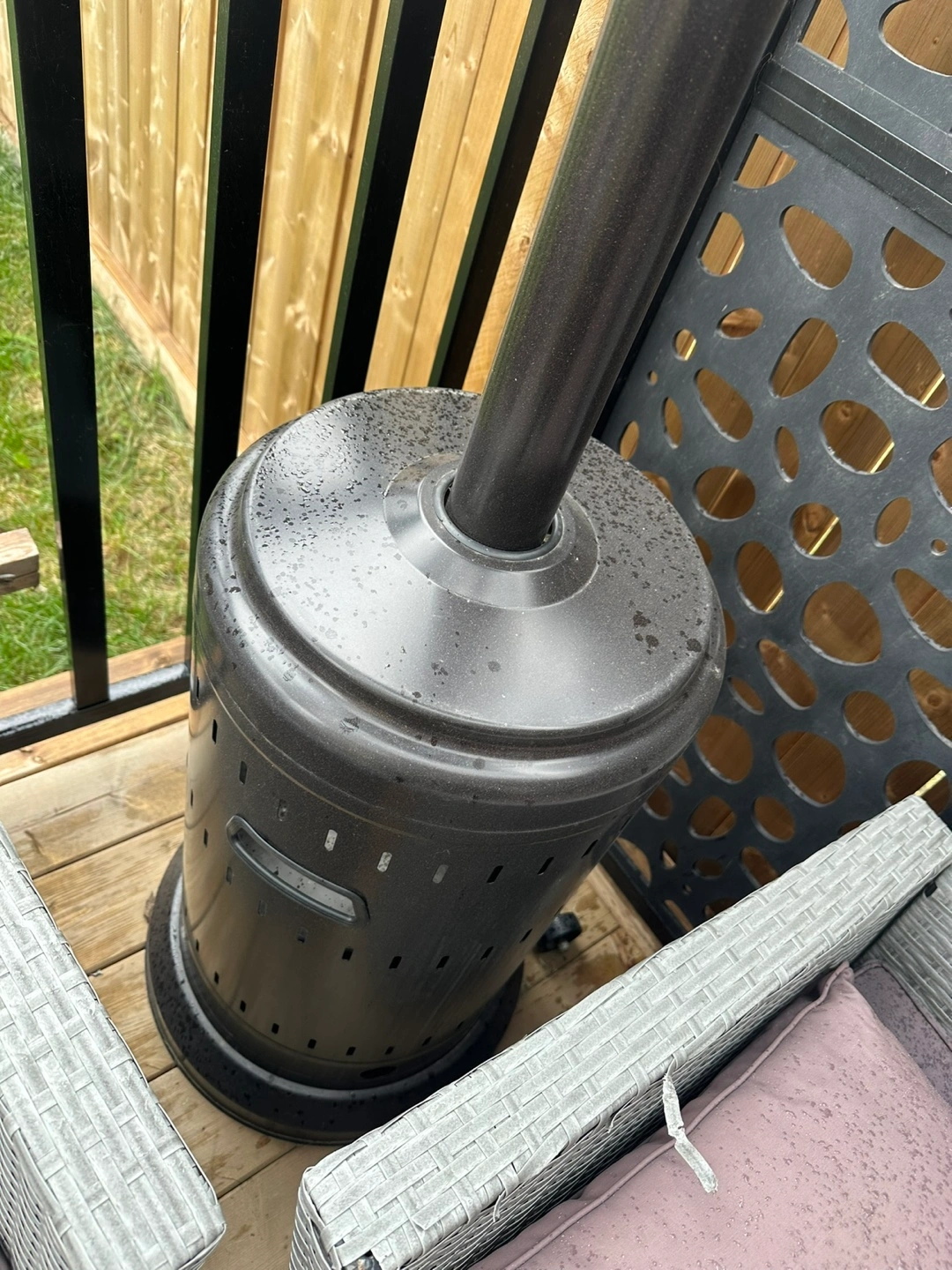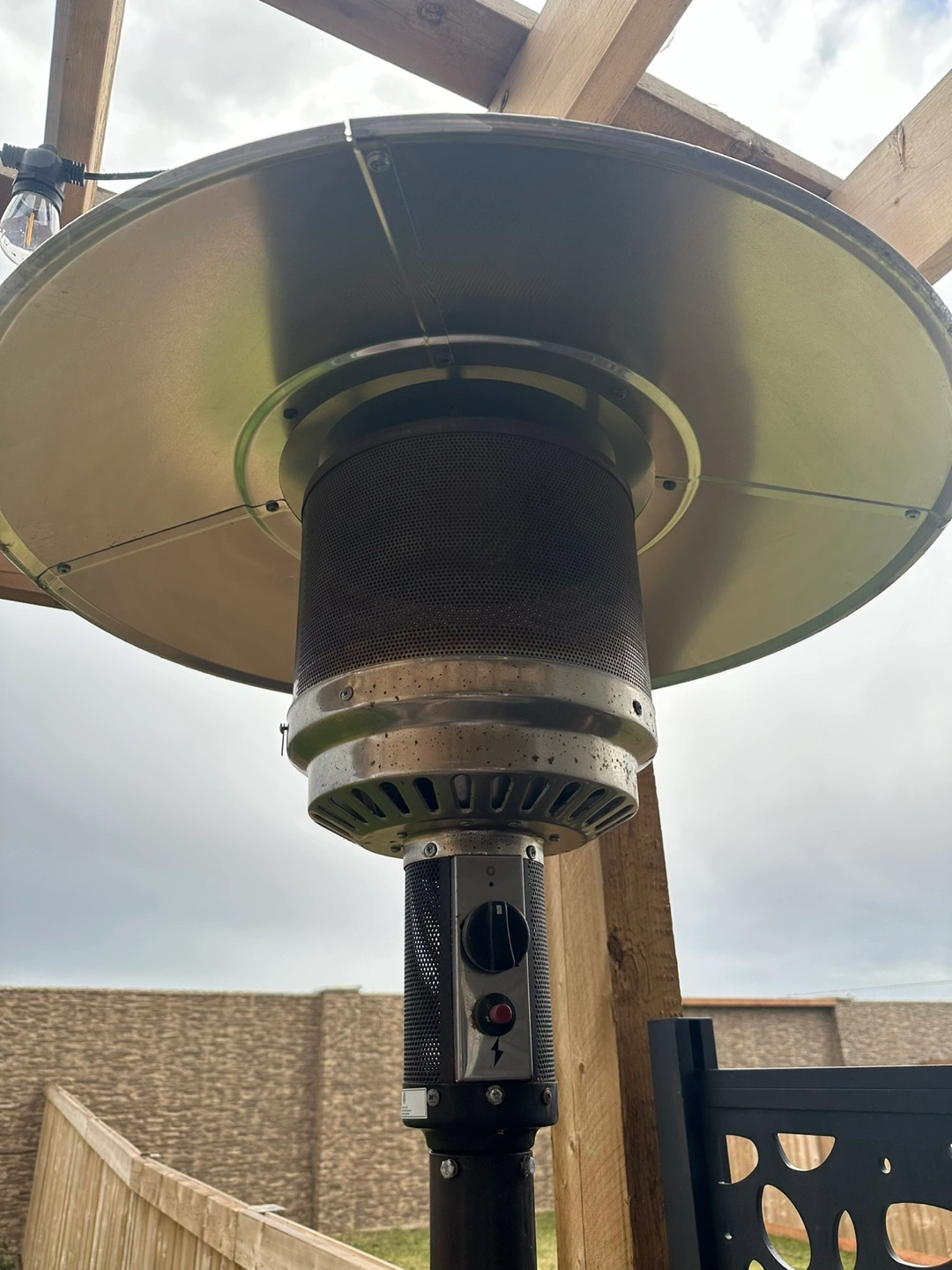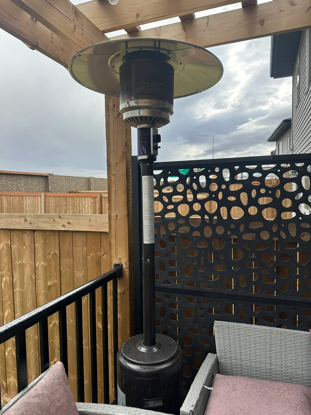 Free-standing patio heater. Bronze coloured. Good for extending the patio season. Includes wheels for easy mobility. Propane tank not included (unless you want to buy it off me, additional $20)
