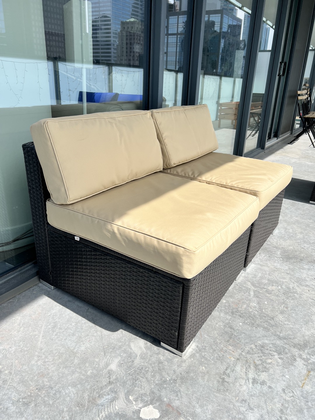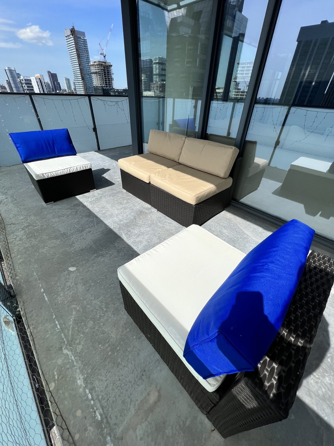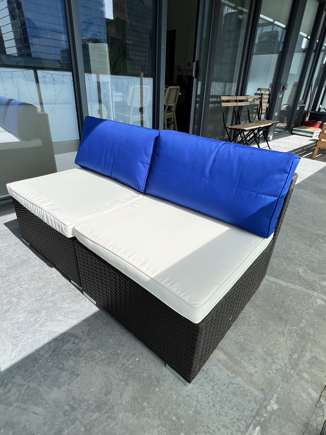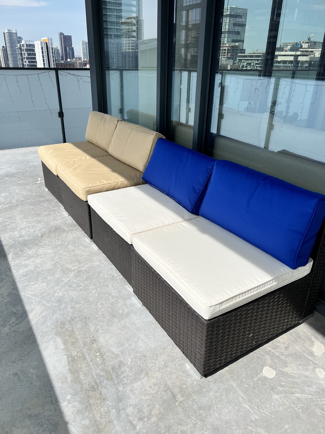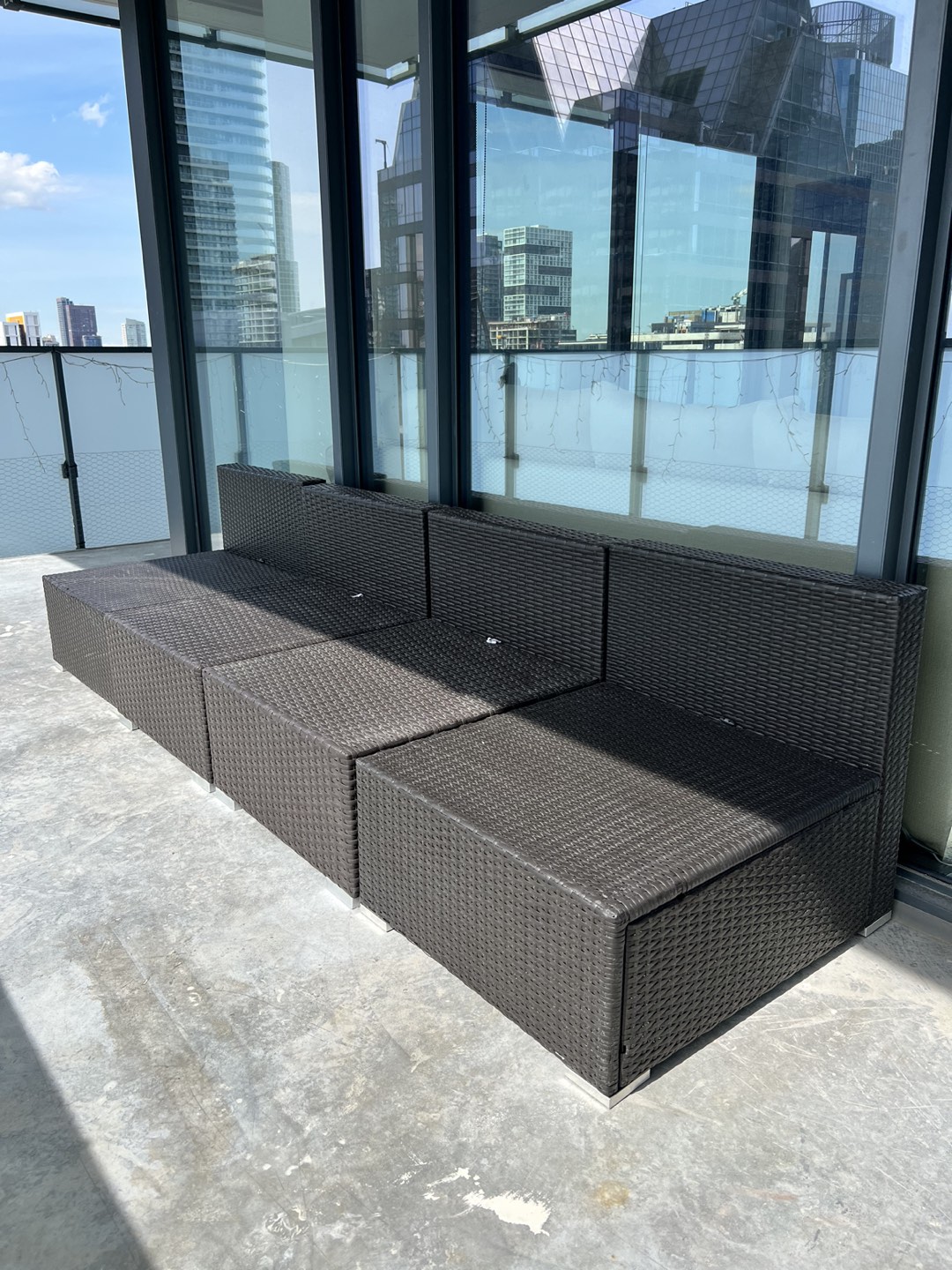 10Set of 4 outdoor lounge chairs. Easy to adjust to any space by separating or placing them next to each other. Cushions have removable covers. Selling these because we are moving. Each seat is: 65cm wide 75cm deep (seating part is 65cm deep) 62cm high on the back part 32cm high on the seat part