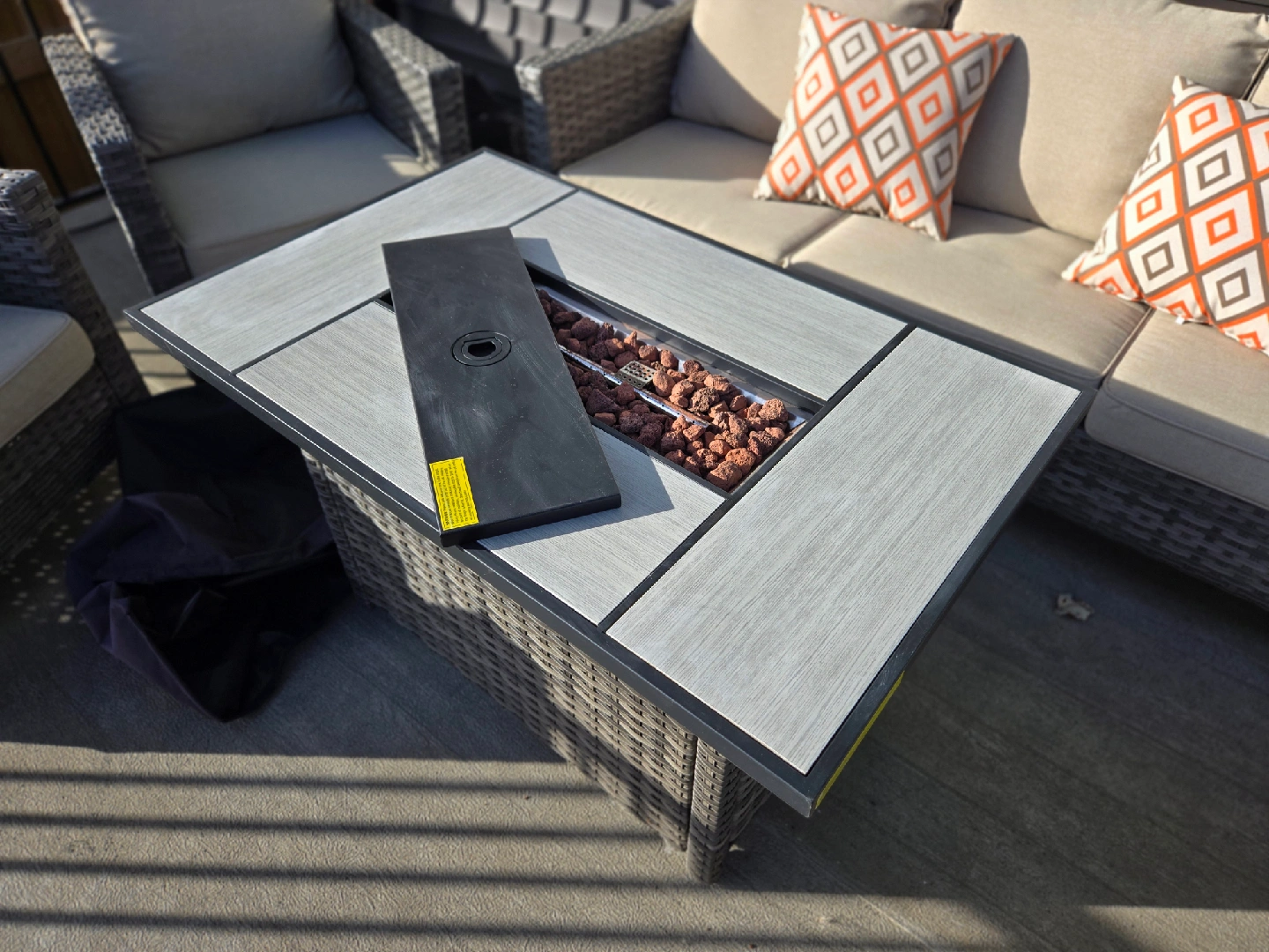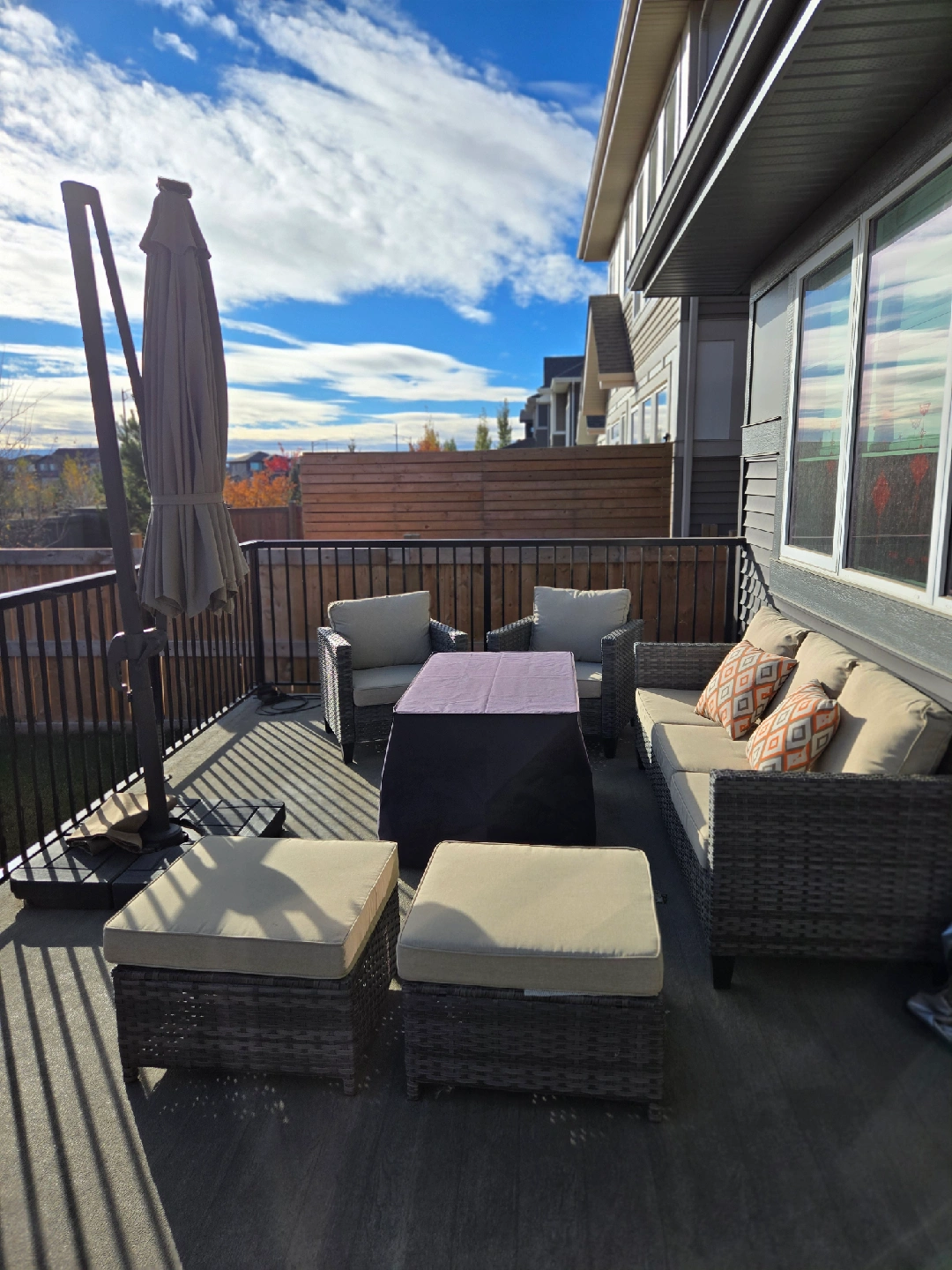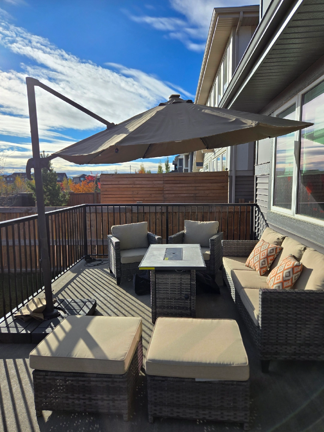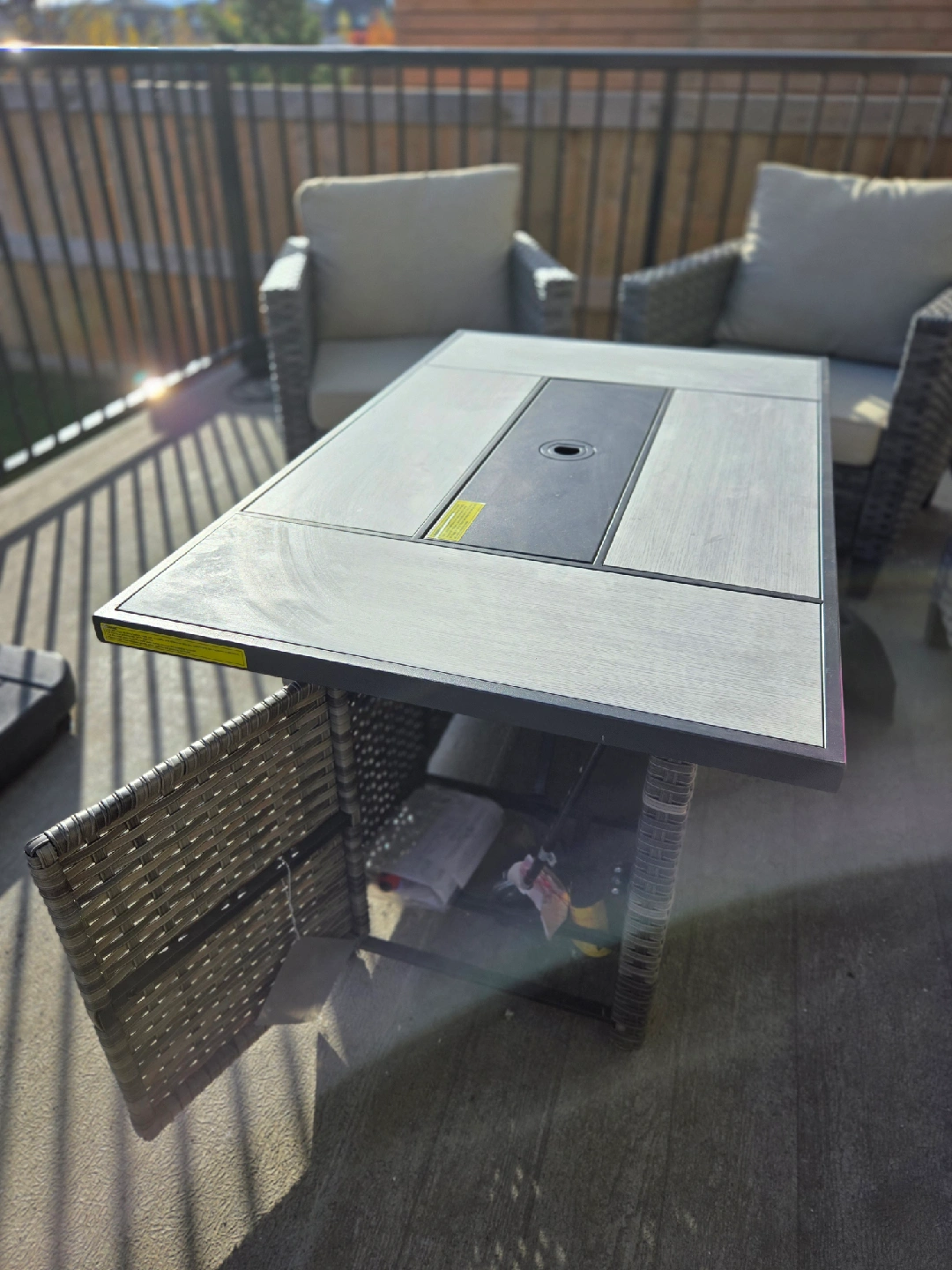 37Selling an outdoor patio set that includes a fire table! It's perfect for enjoying evenings outside. The set includes chairs, a sofa, and ottomans, creating a cozy and inviting space on your deck or patio. The fire table adds warmth and ambiance, making it ideal for entertaining or relaxing with family and friends. The umbrella has solar panel on the top. *please check my other active listing.